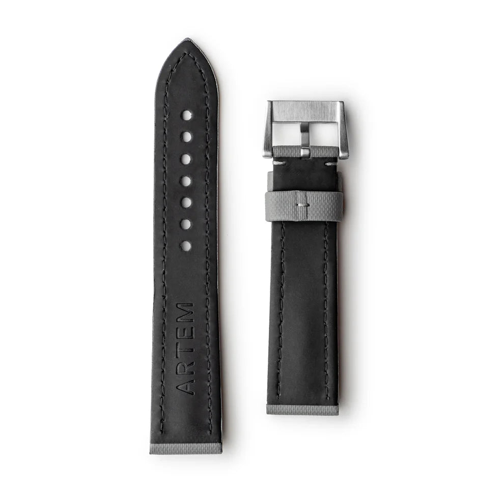 The matching grey stitching enhances the clean, uniform aesthetic of the strap, offering a subtle, sophisticated appearance that complements a variety of timepieces. The strap features a soft leather backing for added comfort and breathability, preventing irritation during prolonged wear. With reinforced edges for longevity and a robust stainless steel buckle, the Artem Classic Sailcloth strap ensures both a secure fit and durability.