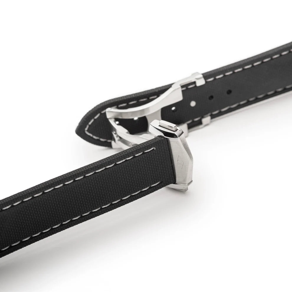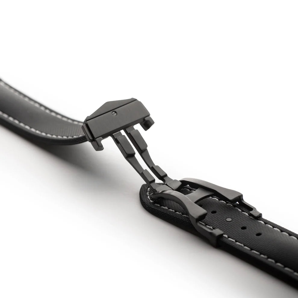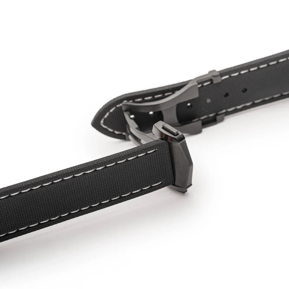 The Artem Loop-Less™ HydroFlex™ Event Horizon Edition sailcloth watch strap is a sophisticated and functional addition to any timepiece. Made from high-grade sailcloth material, this strap combines durability and water resistance, ideal for daily wear and demanding environments. The sailcloth construction offers a textured finish that gives the strap a sleek, modern look, while the all-black design with matching black stitching adds a minimalist, monochromatic appeal.