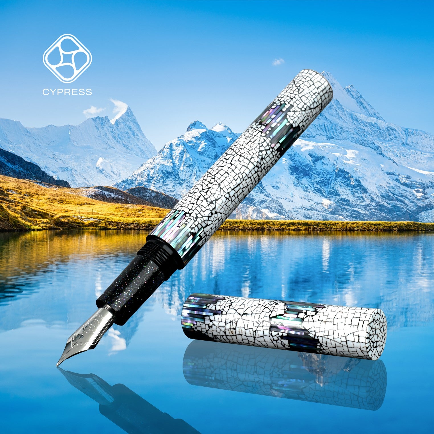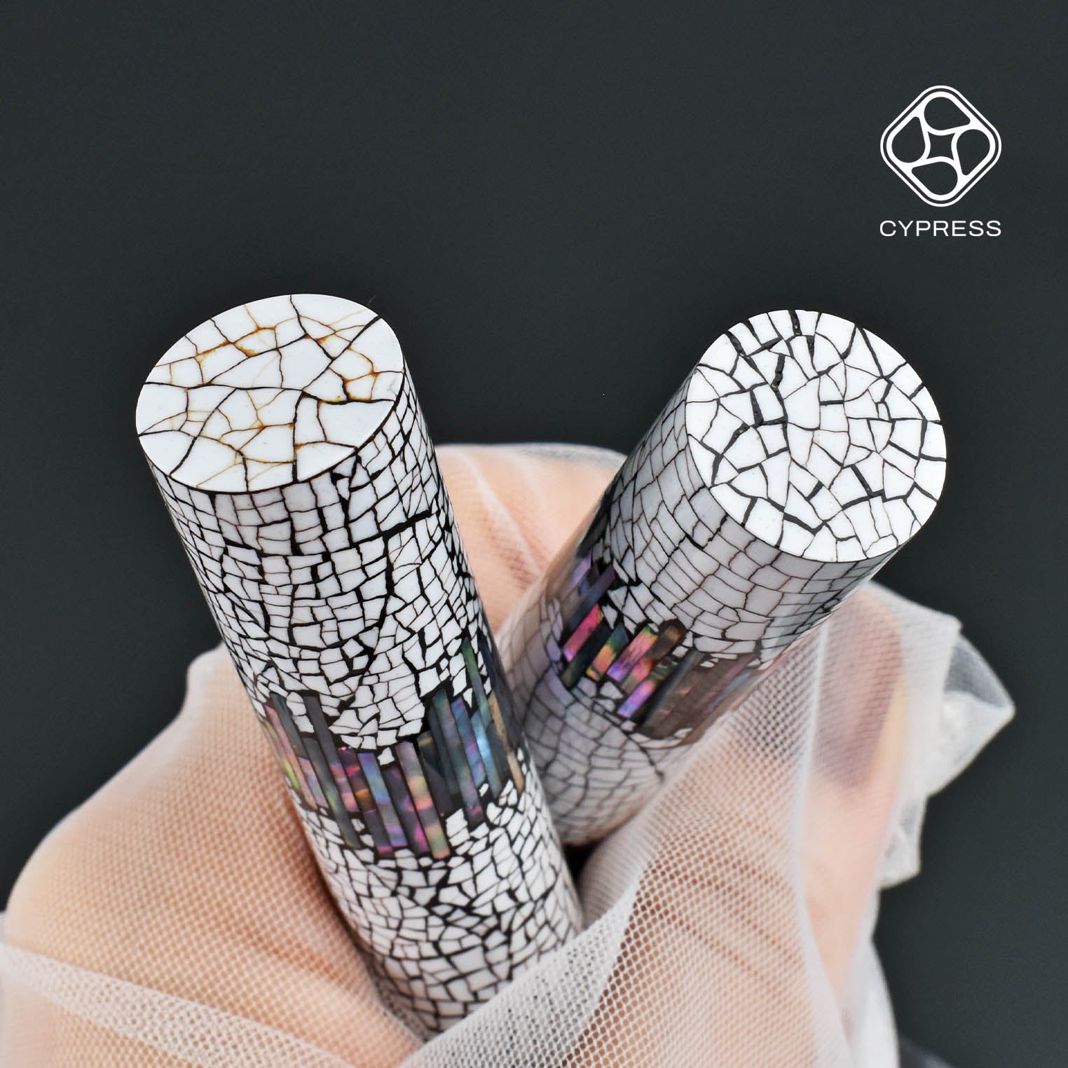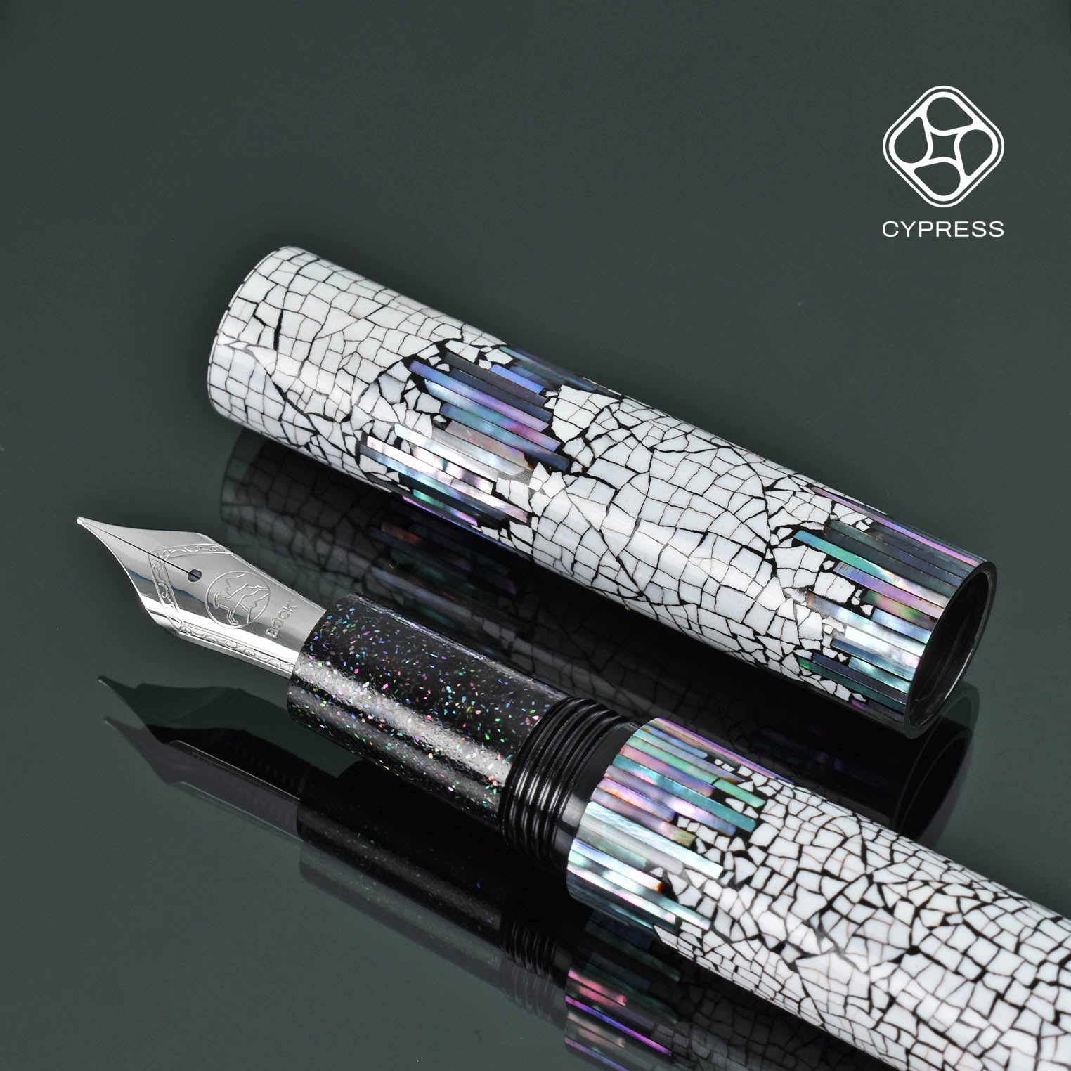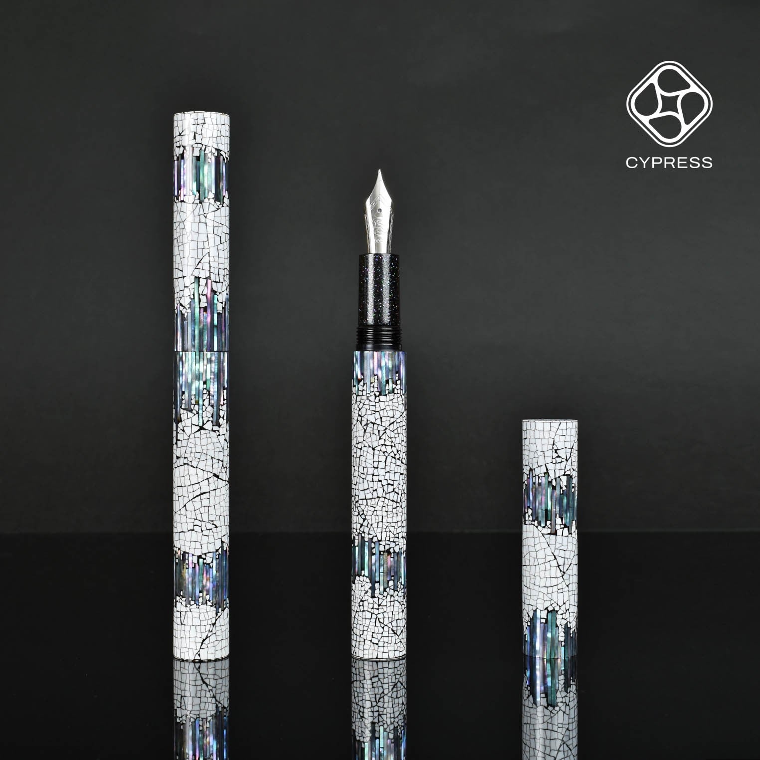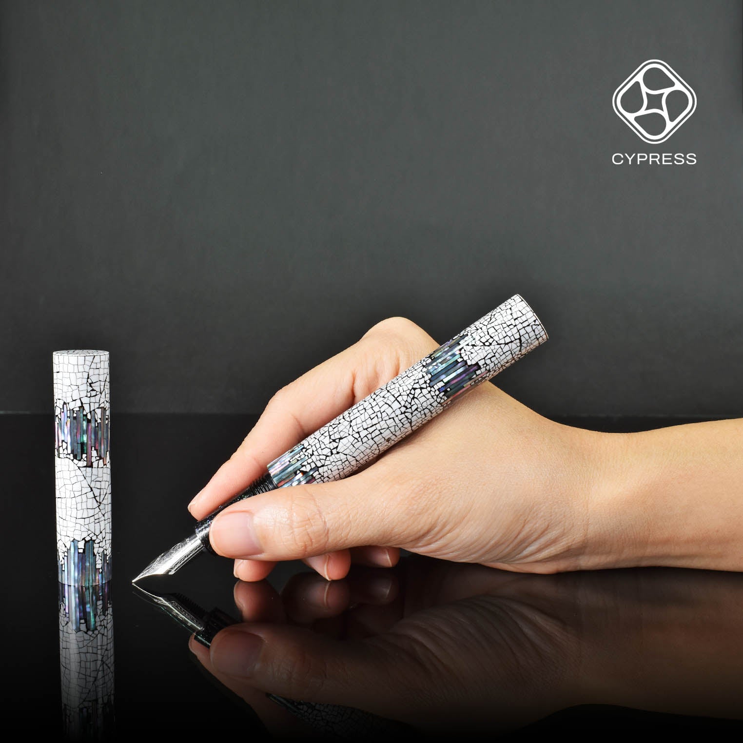 The Cypress Eggshell E05-A Fountain Pen stands as a testament to refined craftsmanship, blending natural materials with modern functionality. The pen’s body is adorned with a stunning eggshell raden finish, a delicate yet intricate process where tiny fragments of eggshell are meticulously embedded into layers of lacquer, creating a unique, textured surface that shimmers with subtle elegance. The result is a captivating mosaic pattern, offering both a visual and tactile experience that is unmatched.