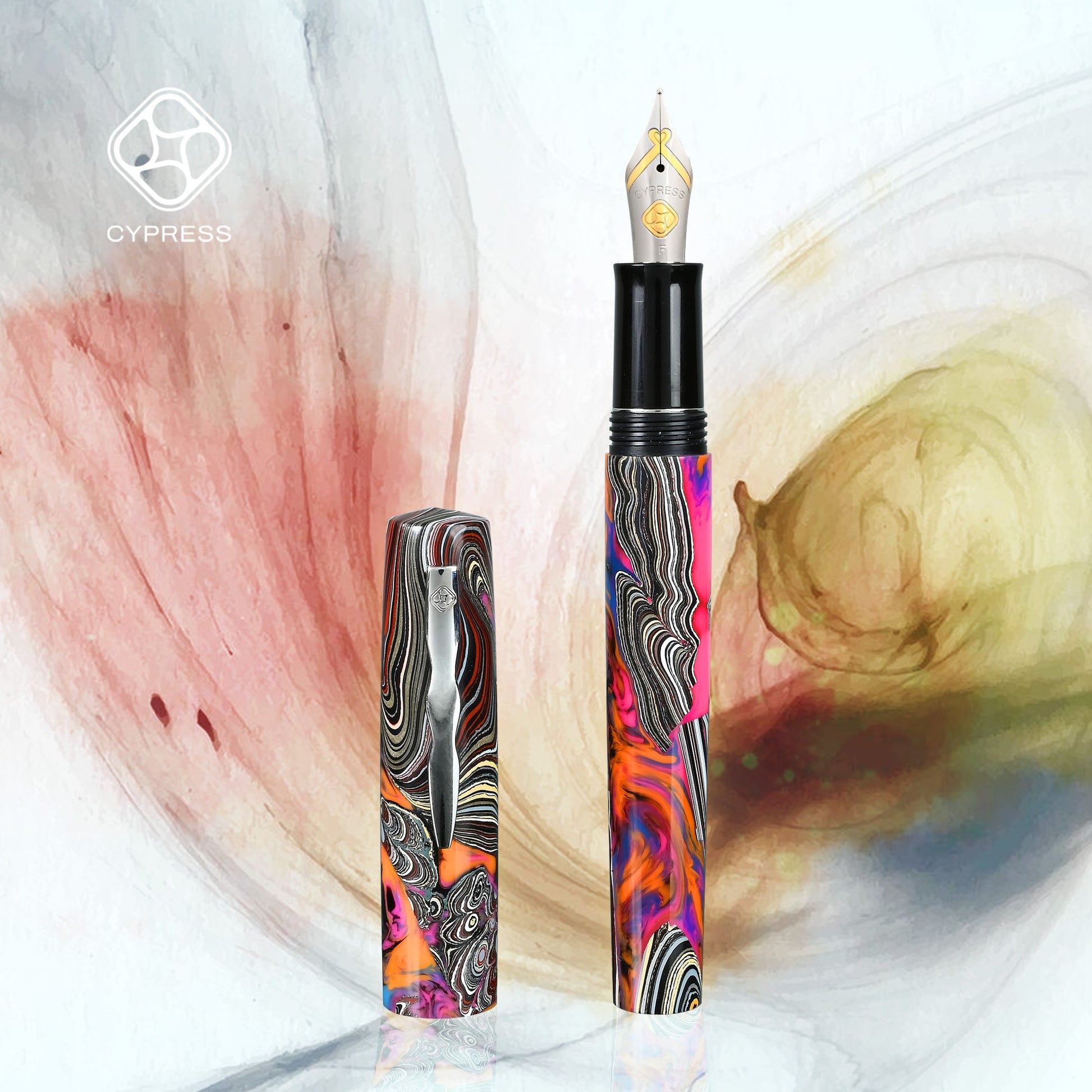 The Cypress Fordite Fountain Pen is a rare blend of modern artistry and functional elegance, crafted to celebrate the unique beauty of recycled materials and superior writing performance. Featuring a barrel made from genuine Fordite, also known as "Detroit agate," this pen encapsulates history, sustainability, and luxurious craftsmanship.
