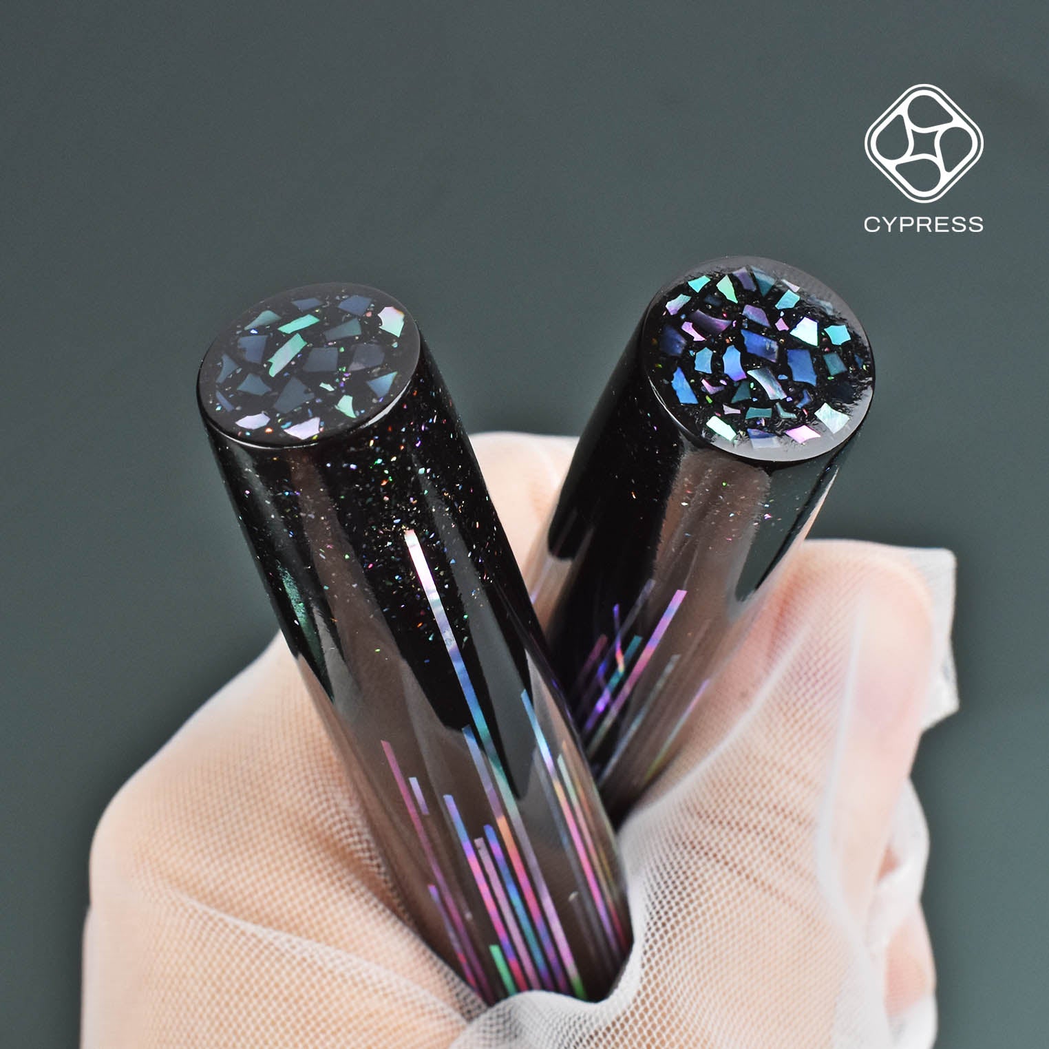 The Cypress Modern Raden All Embracing Model A Fountain Pen is an extraordinary fusion of modern design and traditional craftsmanship, featuring the intricate Raden technique. Raden is the ancient art of embedding shimmering abalone and mother-of-pearl shell fragments into the pen’s surface, creating an iridescent mosaic that reflects light in vibrant, multicolored hues. The pen’s sleek, cylindrical body showcases this meticulous craftsmanship, providing a stunning visual experience that evolves depending on the angle and lighting.