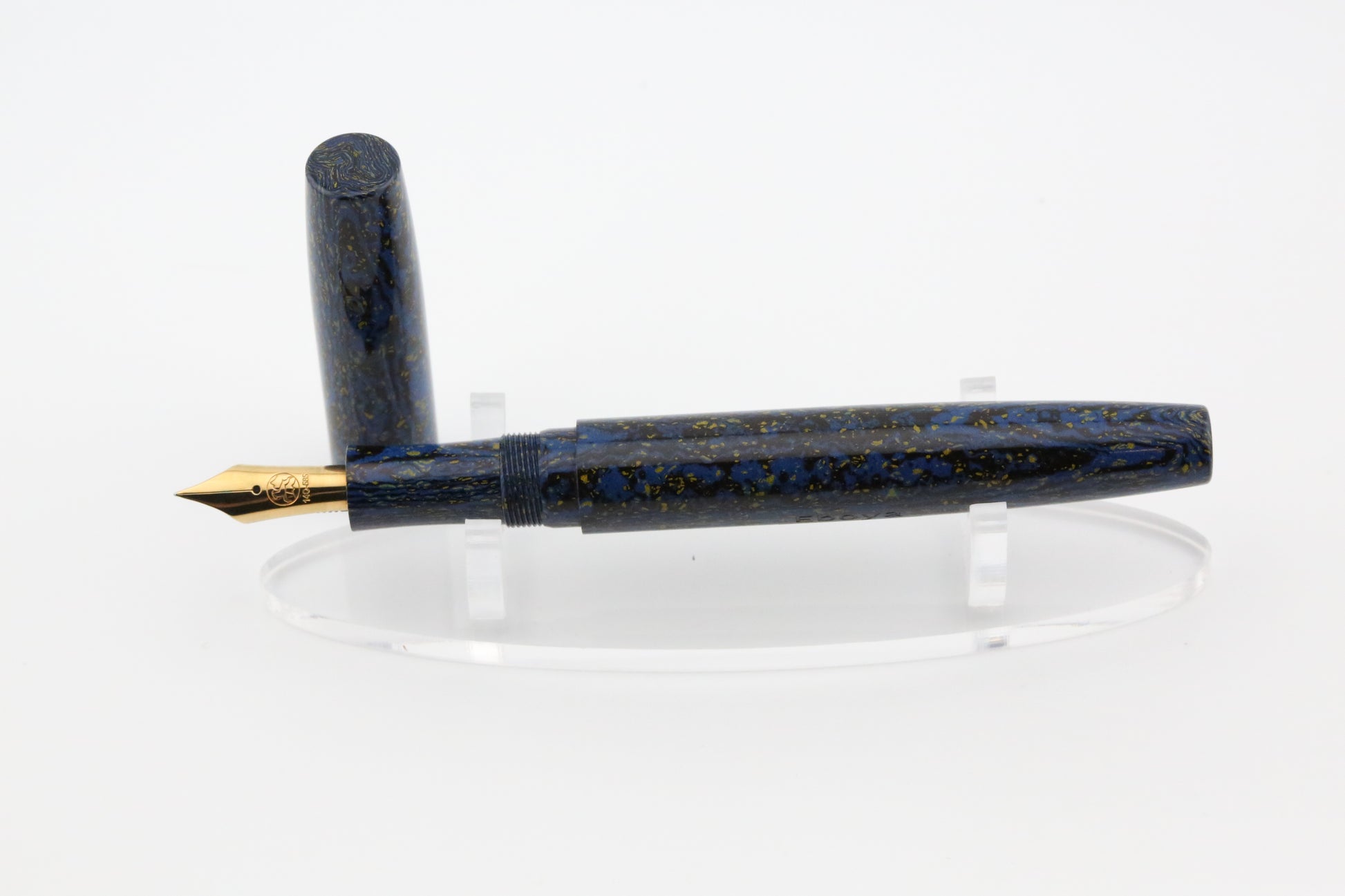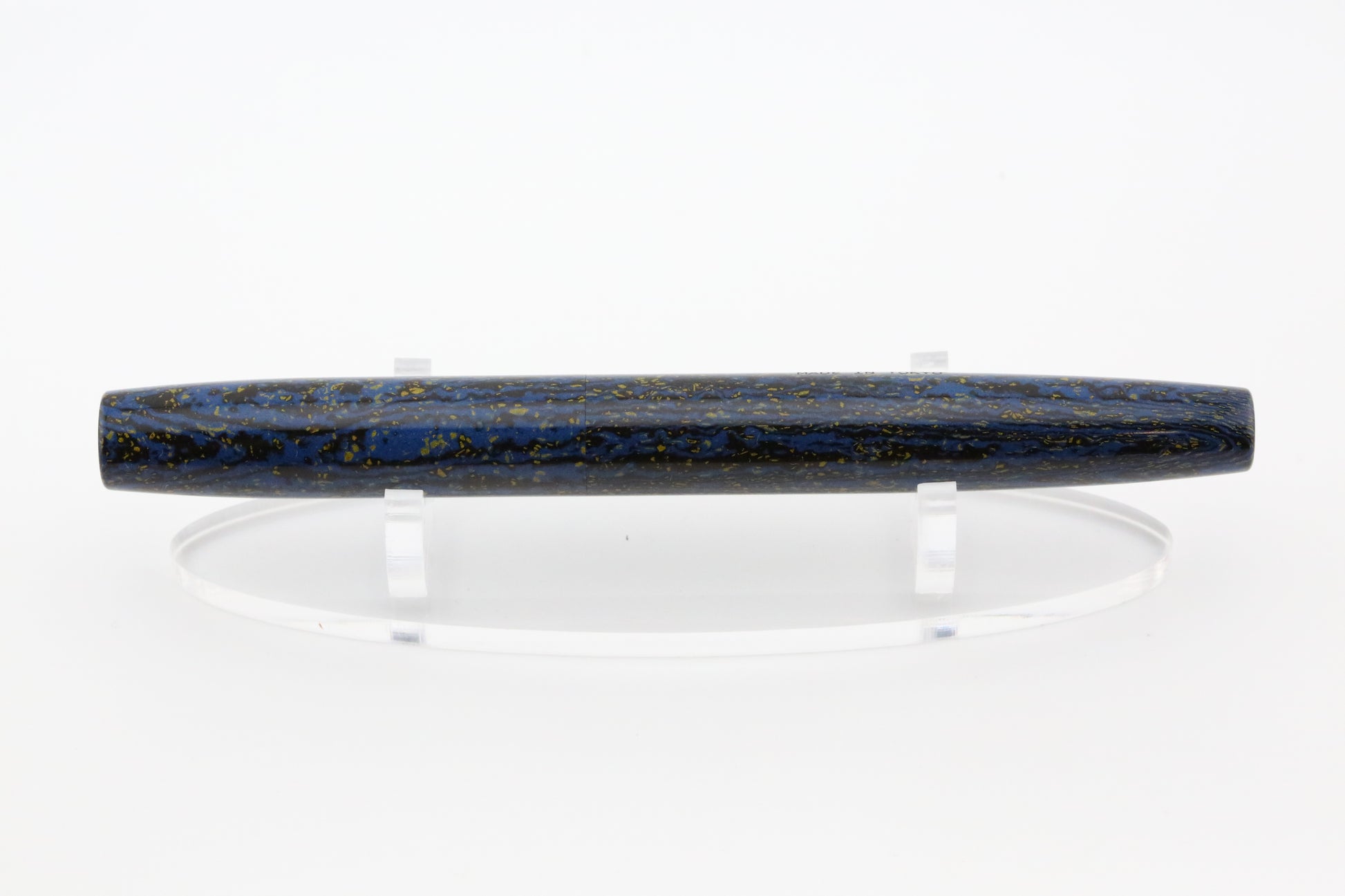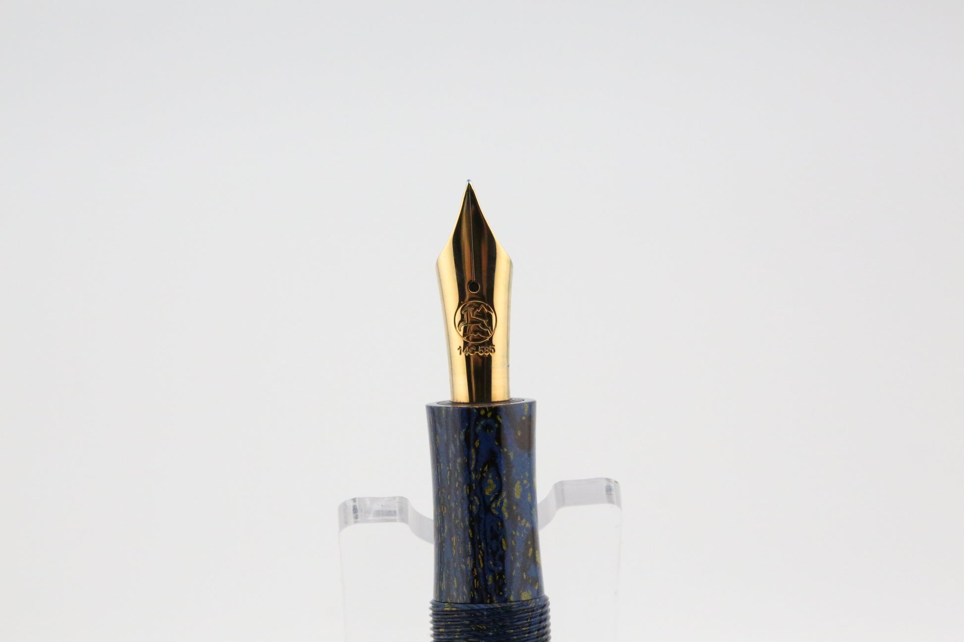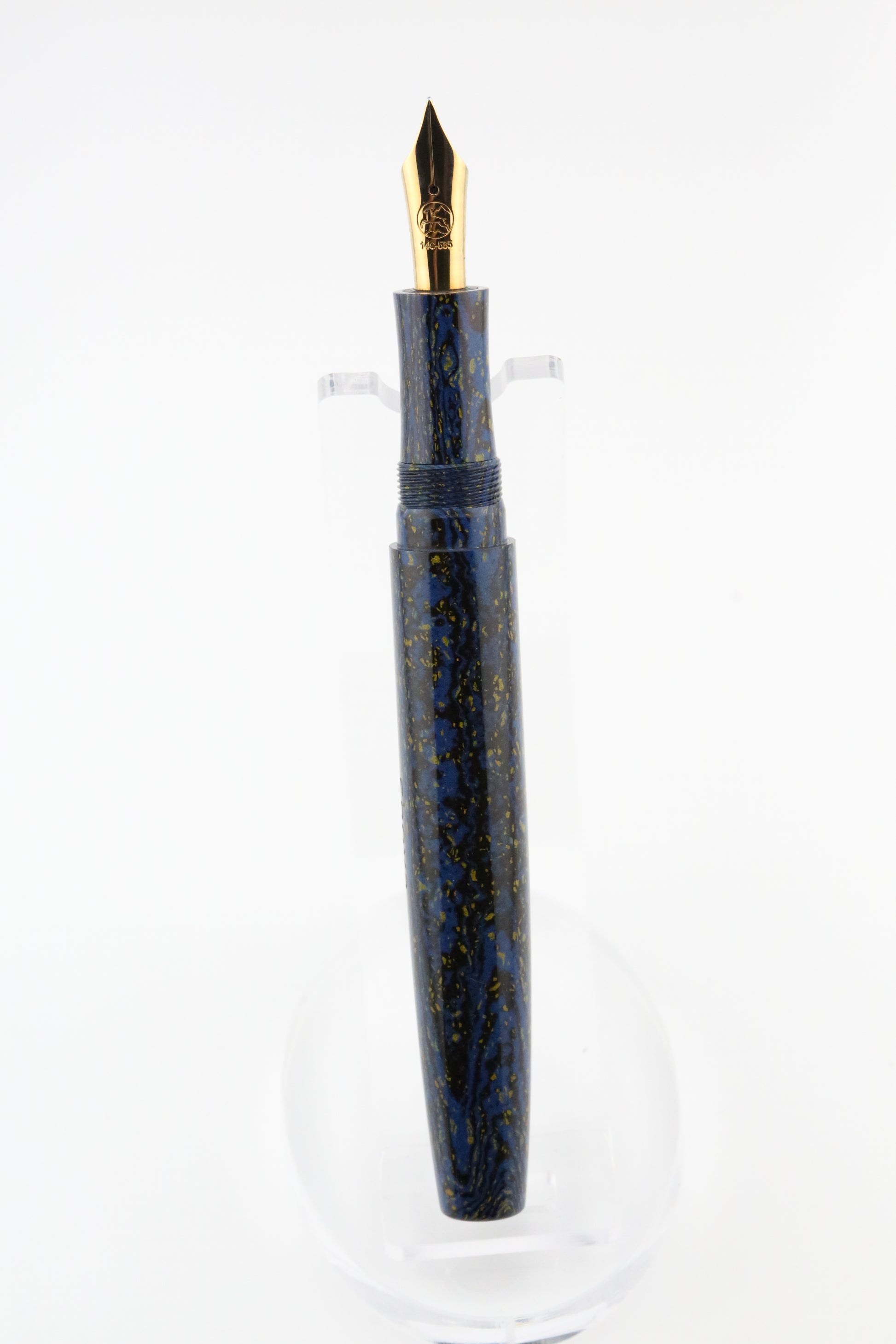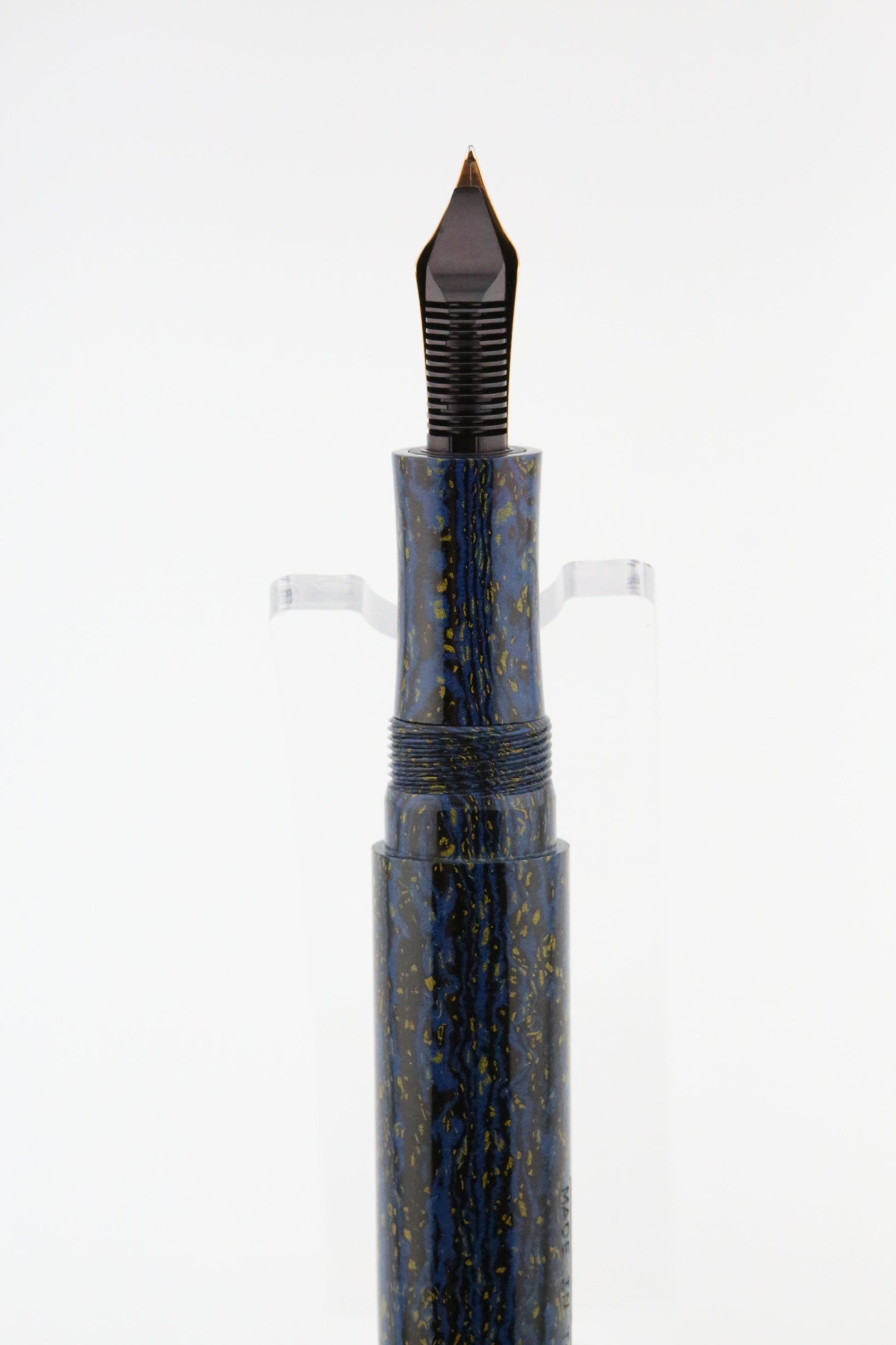 The pen’s body is made from high-quality *ebonite*, a durable, natural hard rubber material, which gives it a warm, tactile feel and exceptional longevity. The *Manten* finish is distinguished by a deep, lustrous blue hue that evokes the serene beauty of a night sky filled with stars, further accentuating the pen's elegance.