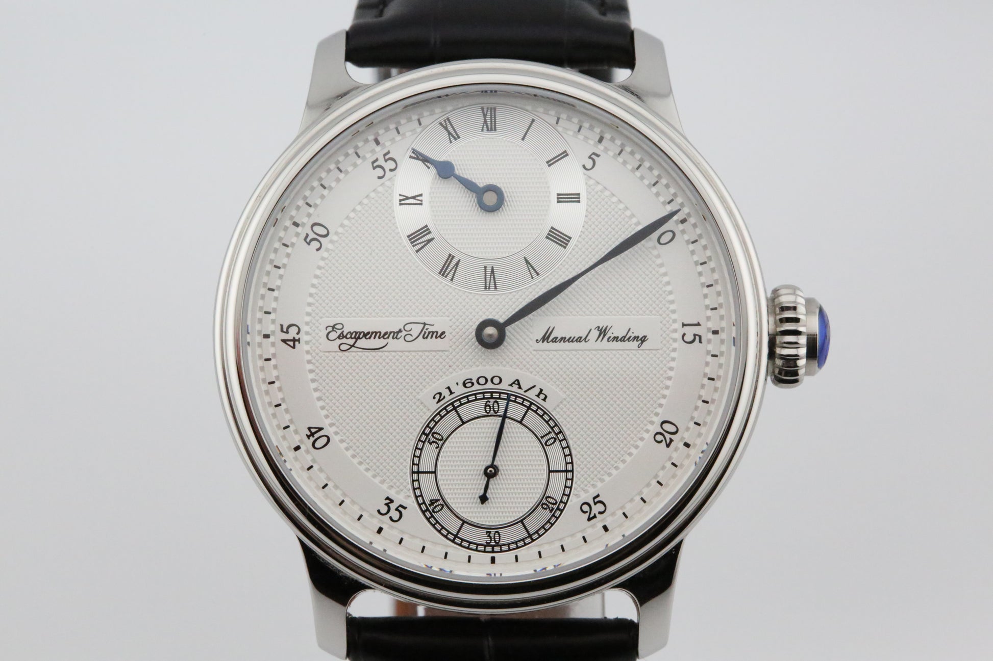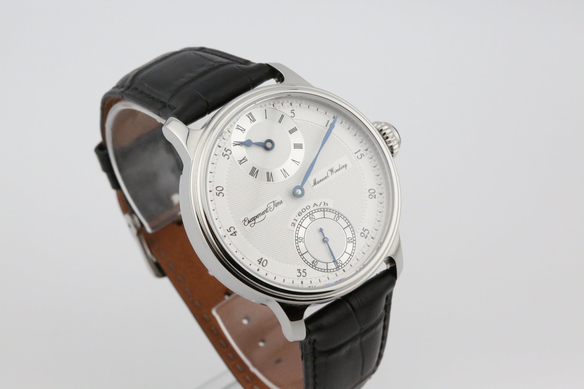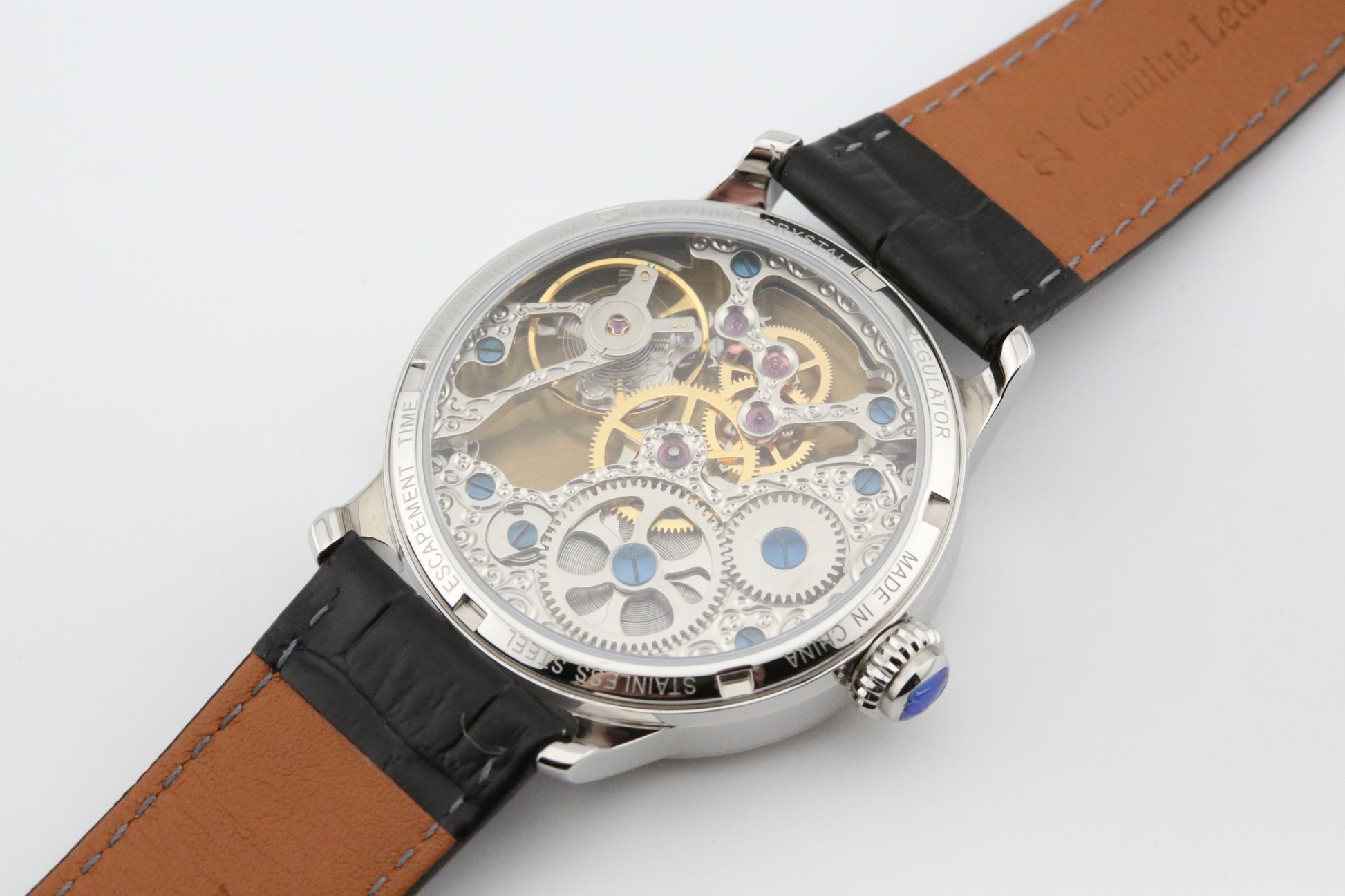 The Escapement Time Regulator Watch is powered by a reliable manual wind movement, ensuring precise timekeeping without the need for batteries. The movement is visible through the **exhibition case back**, allowing a glimpse of the mechanical craftsmanship that powers the timepiece. The watch is fitted with a comfortable leather strap, enhancing its traditional look while ensuring all-day wearability.