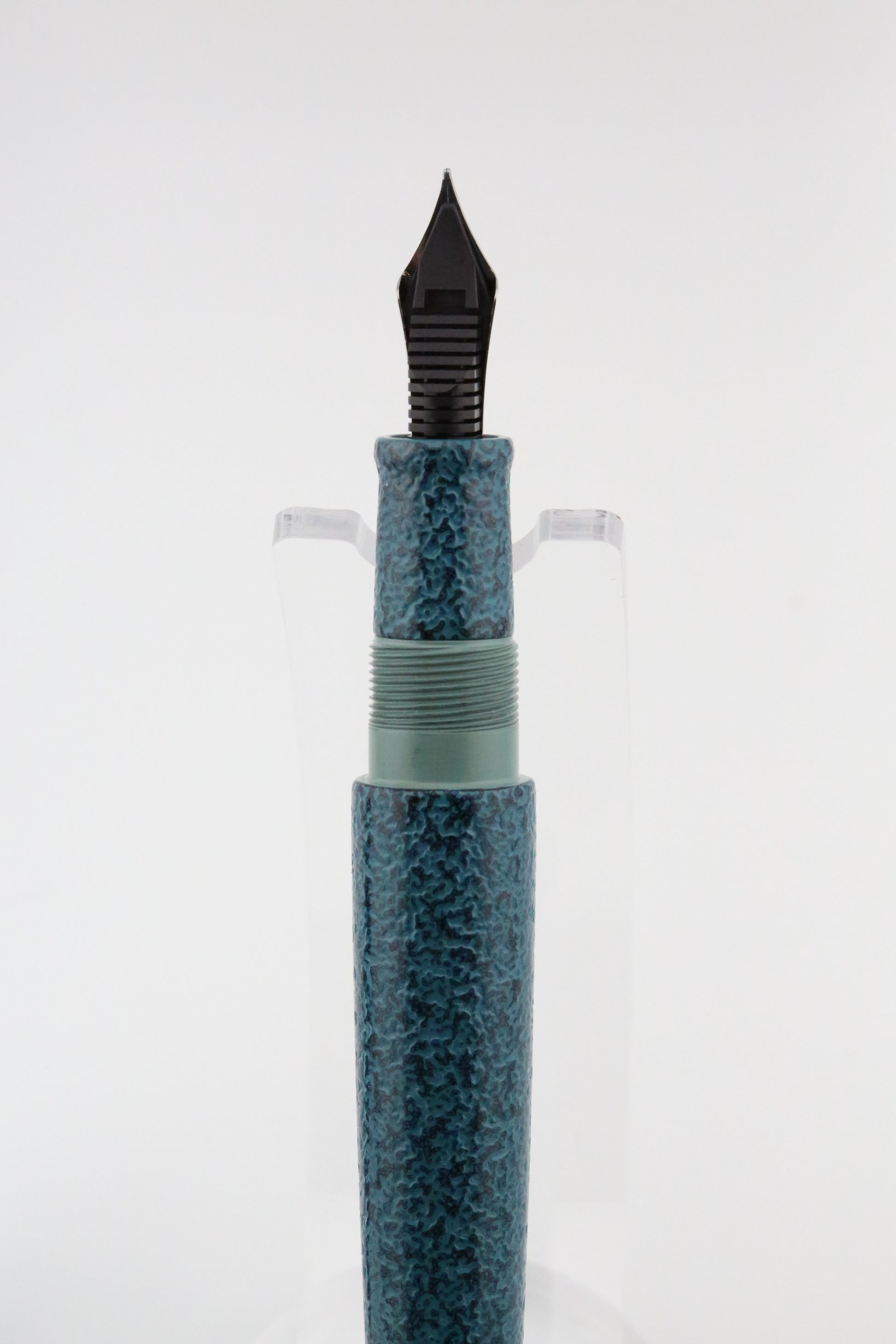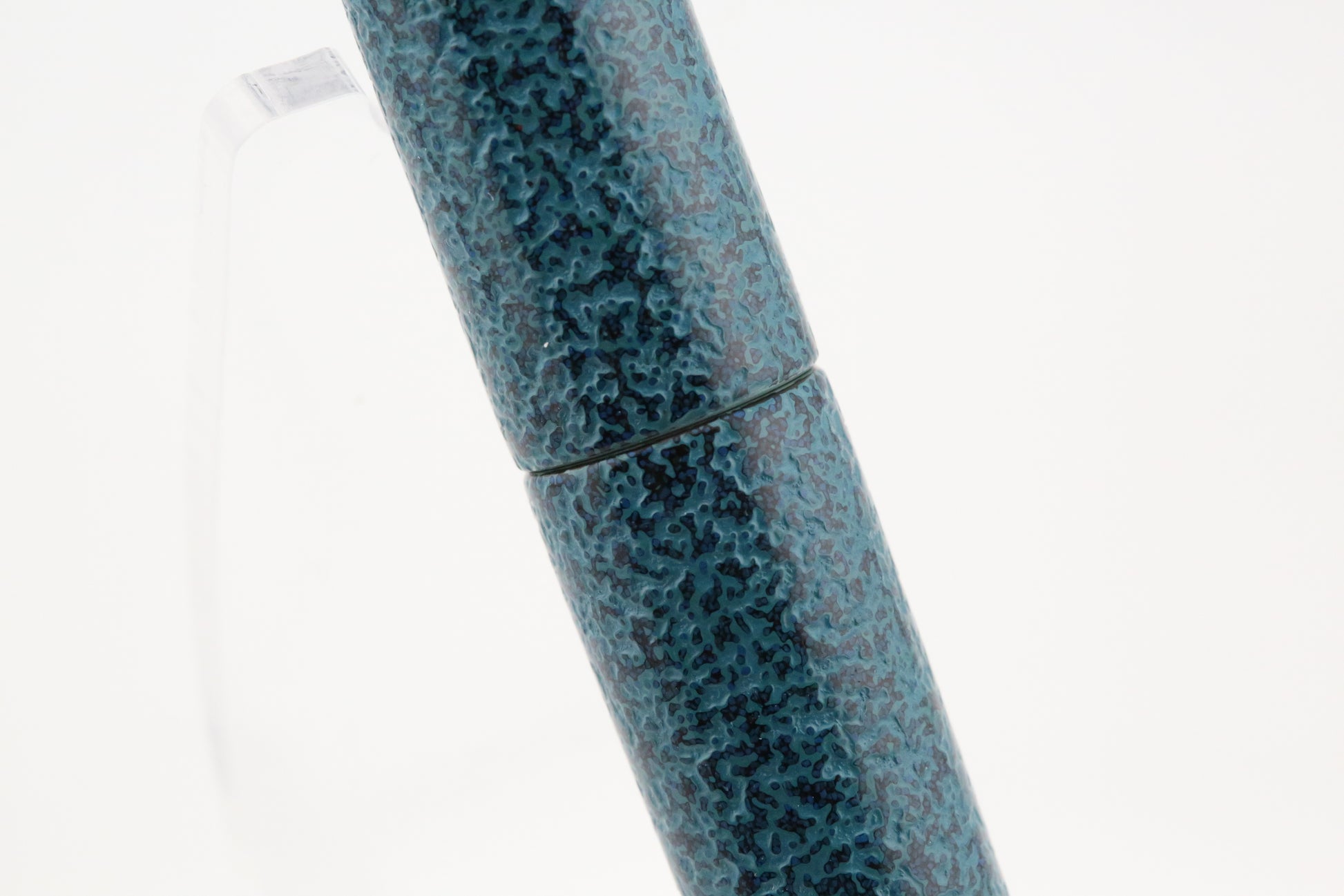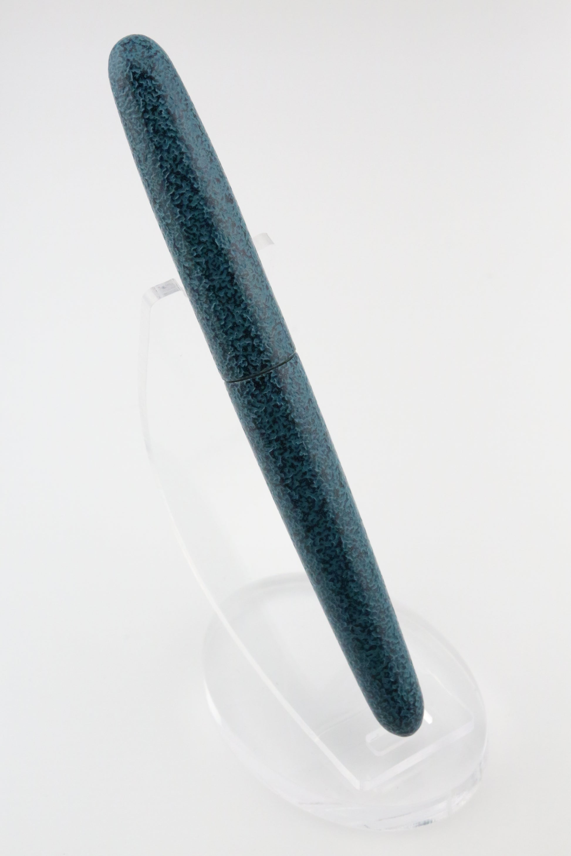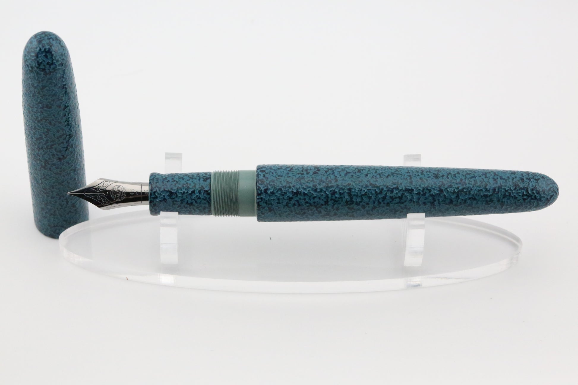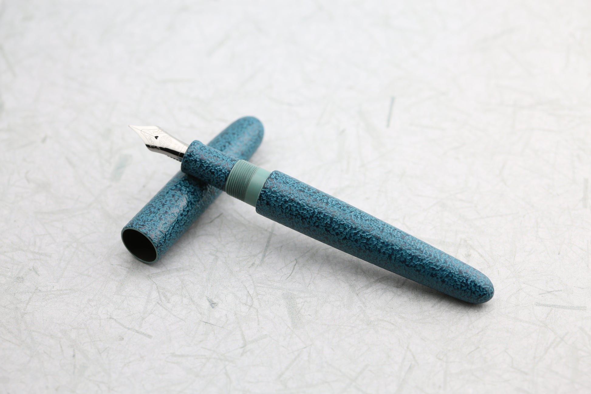 The pen is finished in a rich Midori teal hue, which deepens its organic, earthy appearance. Constructed from *Ebonite*, a durable yet lightweight material, the pen offers a well-balanced feel in hand, making it comfortable for extended writing sessions.