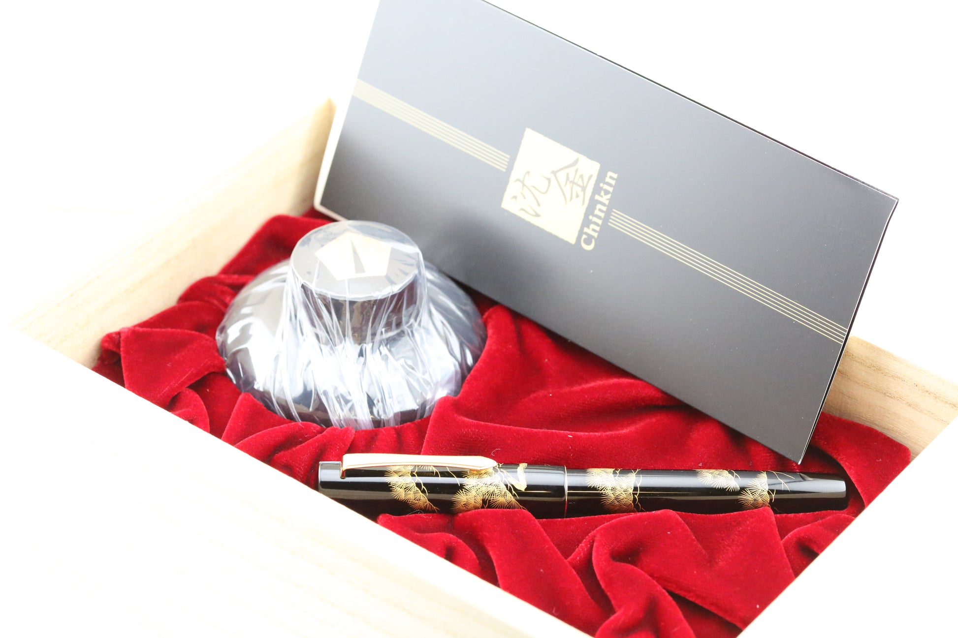 The Namiki Chinkin Pine Tree Fountain Pen is an exquisite piece of craftsmanship, showcasing the traditional Japanese art of Chinkin. This technique involves engraving intricate patterns into the pen’s surface and then applying gold leaf or gold powder to highlight the design. The **pine tree motif**, a symbol of longevity and resilience in Japanese culture, is meticulously hand-engraved on the body of the pen, creating a detailed and elegant visual statement.