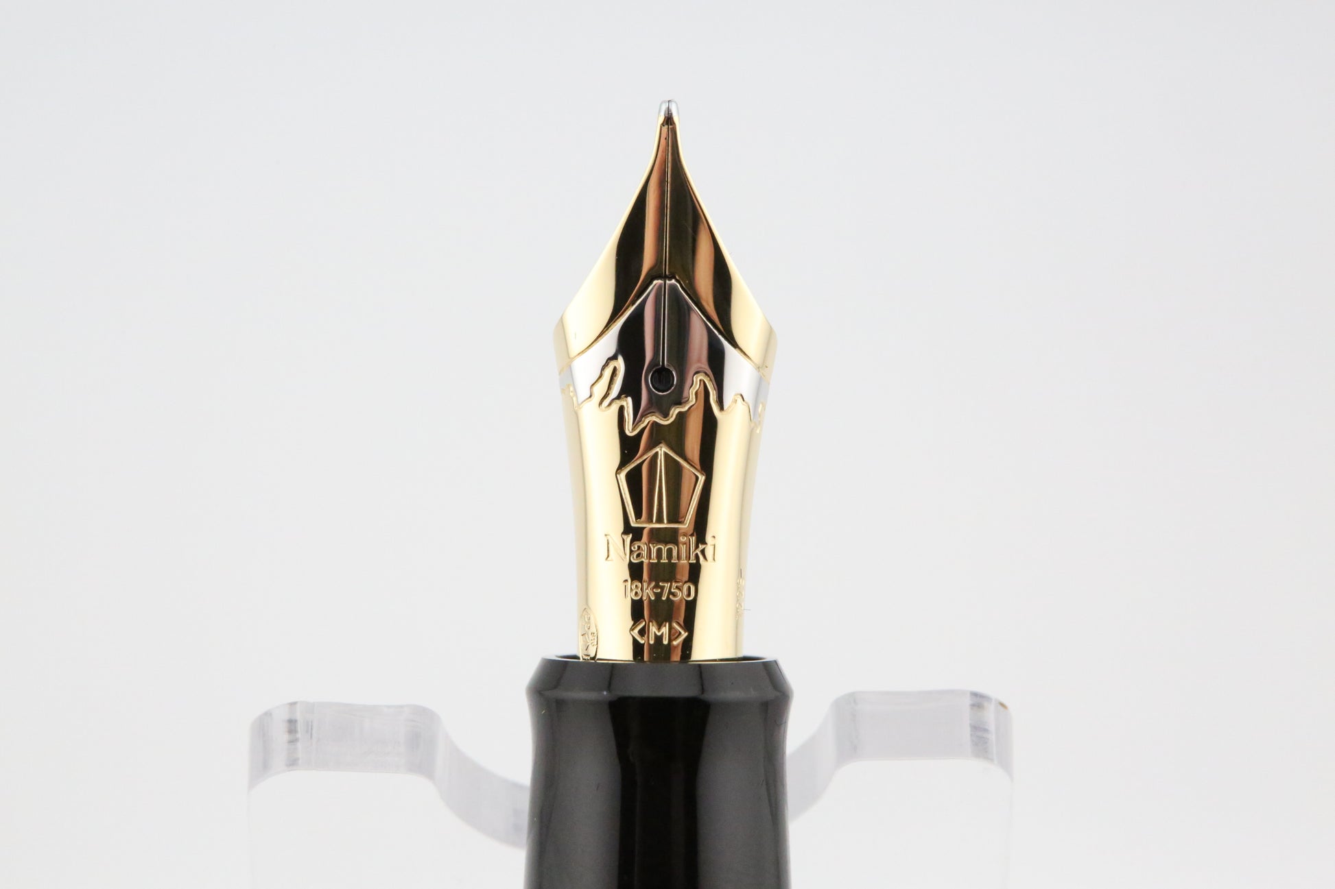 Crafted from **lacquered ebonite**, the pen’s barrel and cap are smooth, with a deep, lustrous black surface that contrasts beautifully with the gold accents. The medium nib is made of **18k gold**, delivering a balance of durability and smooth writing performance. The nib is finely tuned to provide a fluid and consistent ink flow, making it ideal for both everyday writing and artistic expression.
