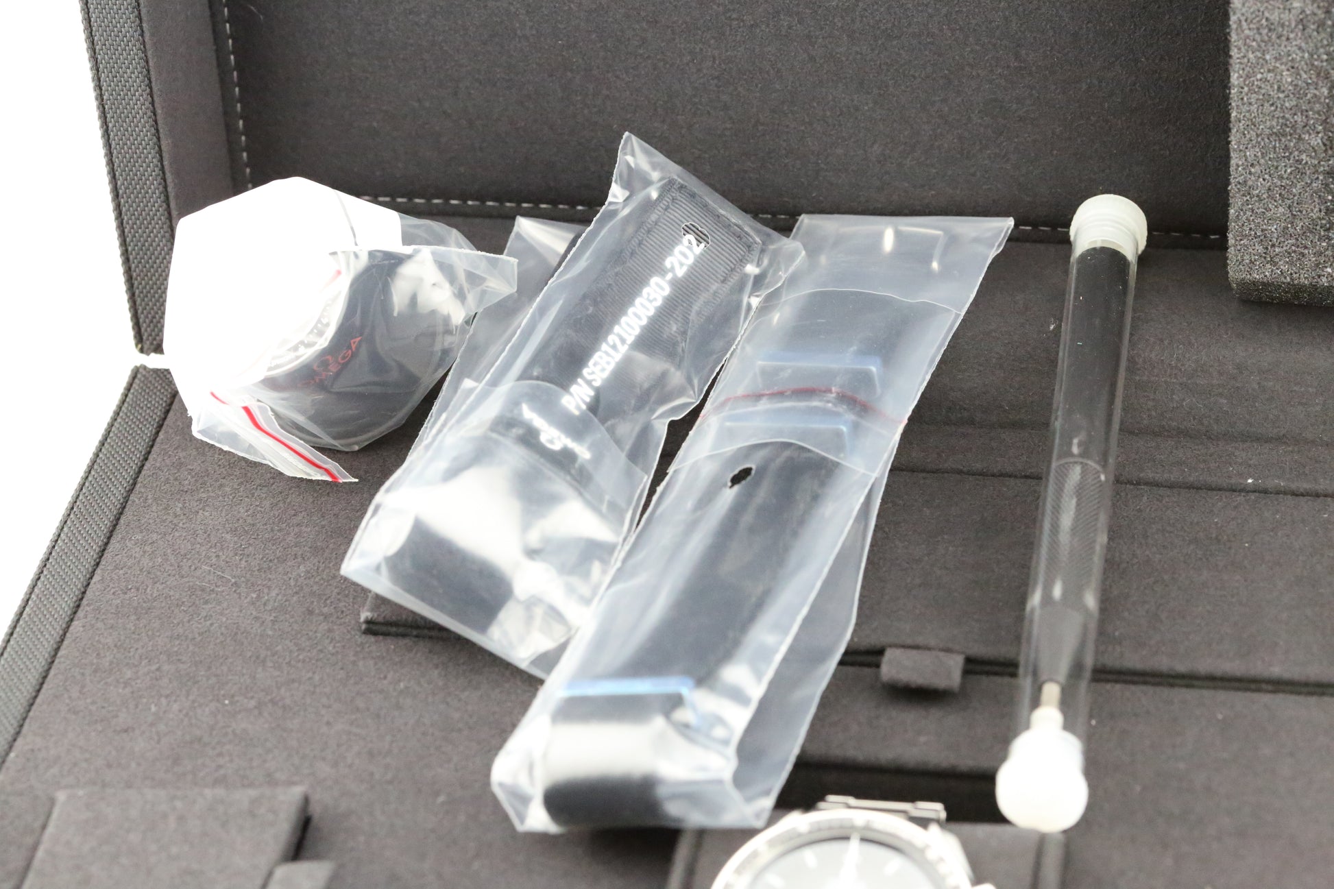 Box: Special Moonwatch presentation box with a NATO strap, a Velcro strap, a tool to change the bracelet, and a book highlighting the Speedmaster's adventures