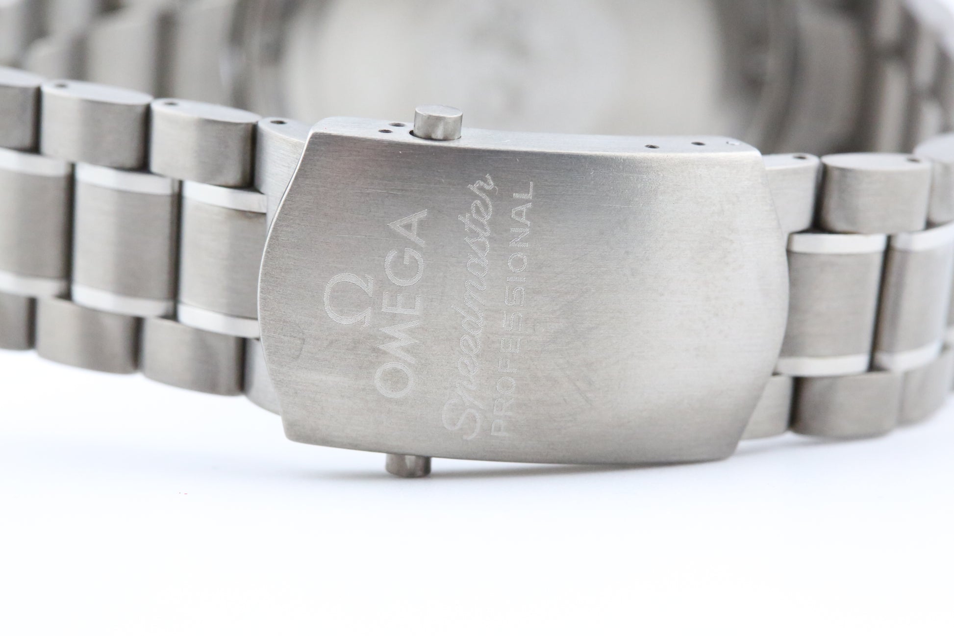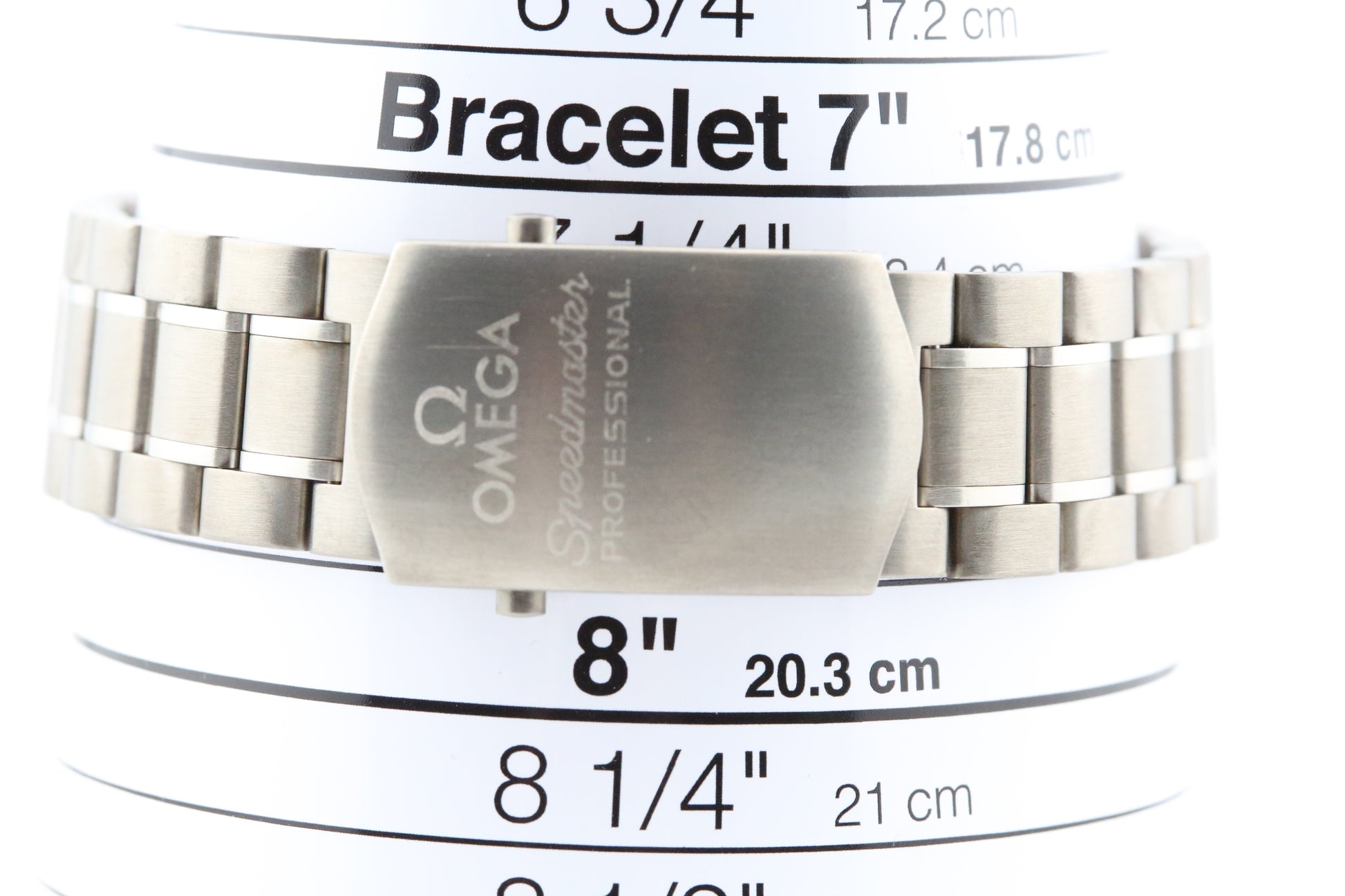 Case Back: Solid titanium case back with an engraved Omega logo and mission-specific information
