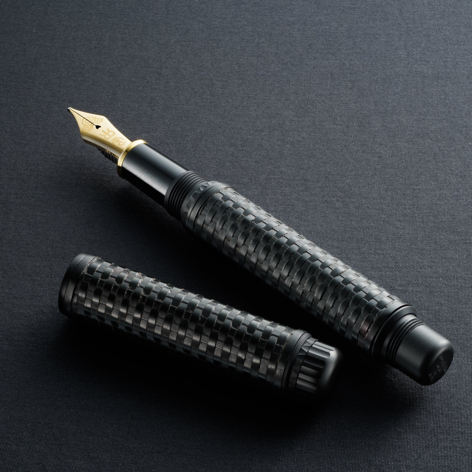 The Platinum Izumo Bamboo Ankokushoku Bark Fountain Pen is a masterful creation that harmonizes traditional Japanese craftsmanship with premium materials. Woven from resilient bamboo, this pen features an "Ankokushoku" or "dark black" finish, giving the surface a bark-like texture, crafted through a detailed multi-step weaving and Urushi lacquering process. This textured surface not only provides a comfortable grip but also conveys a sense of organic authenticity, with subtle grooves and patterns showcasing the texture of natural bamboo.