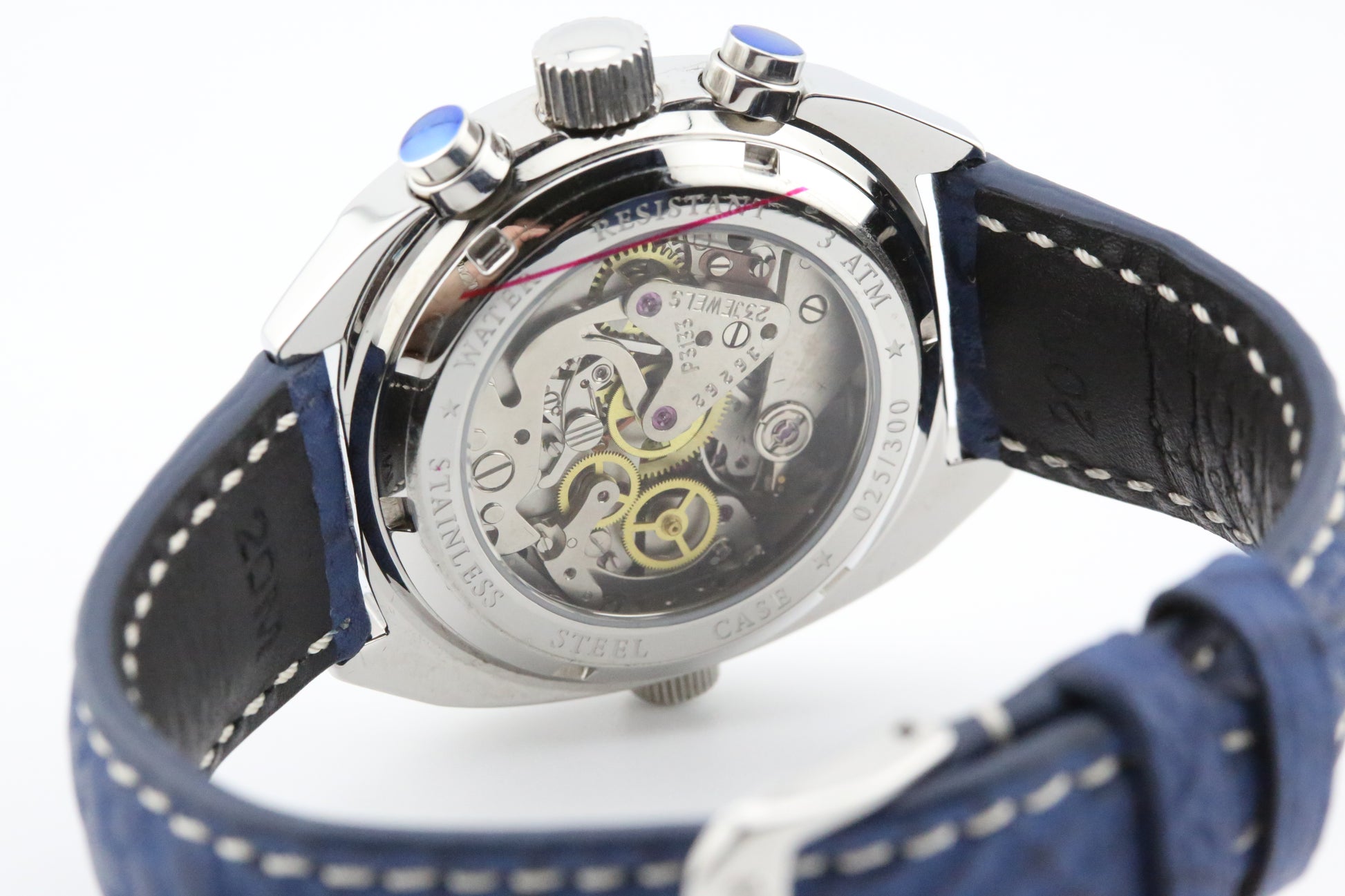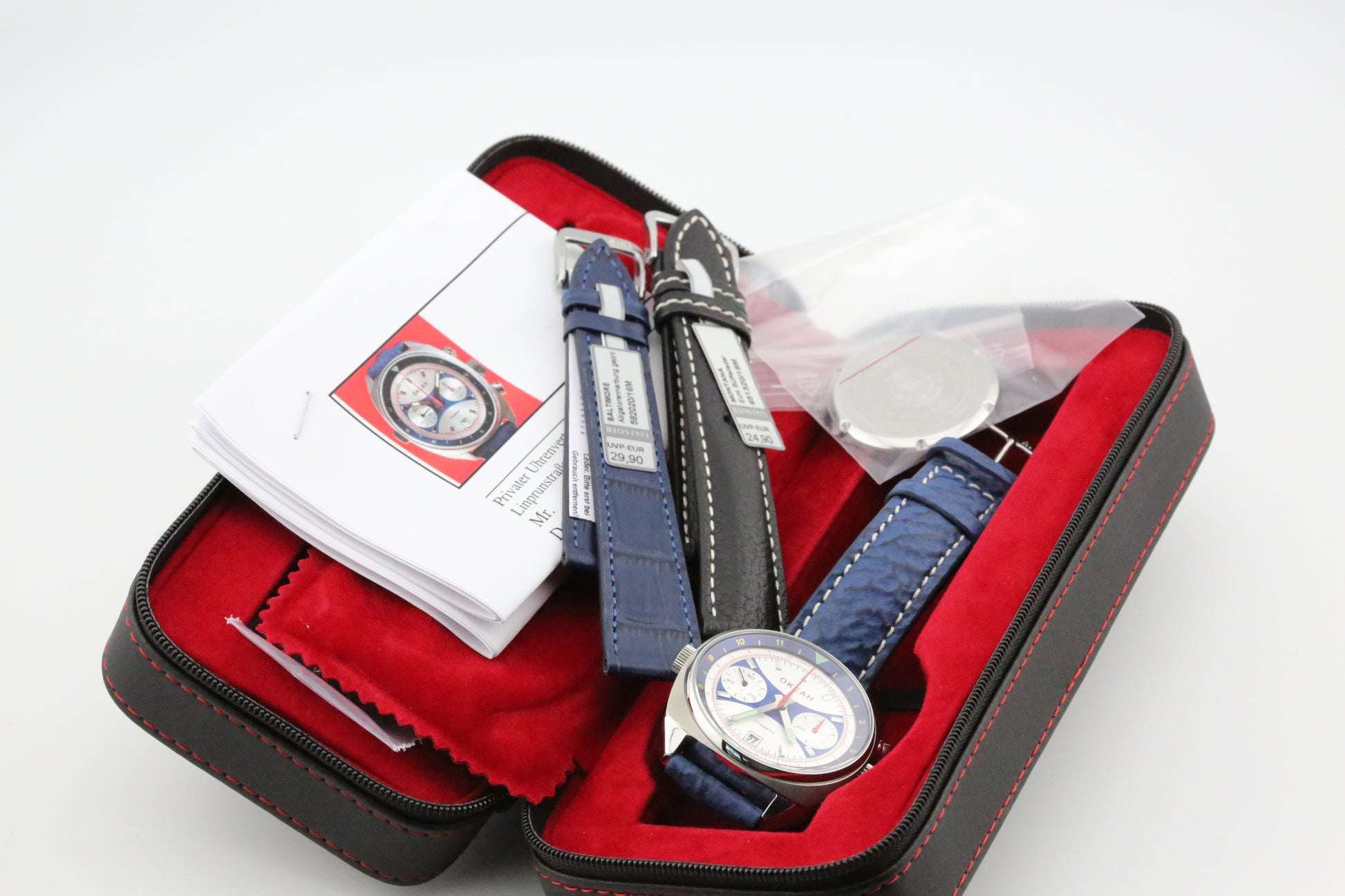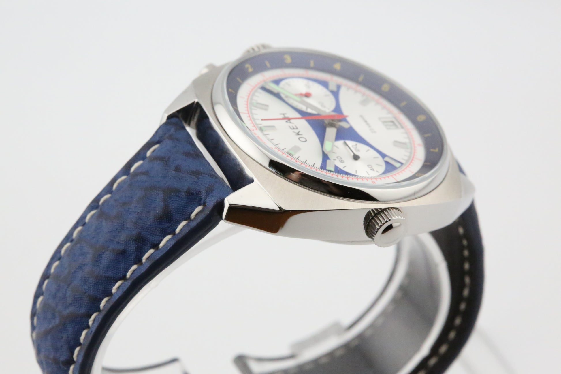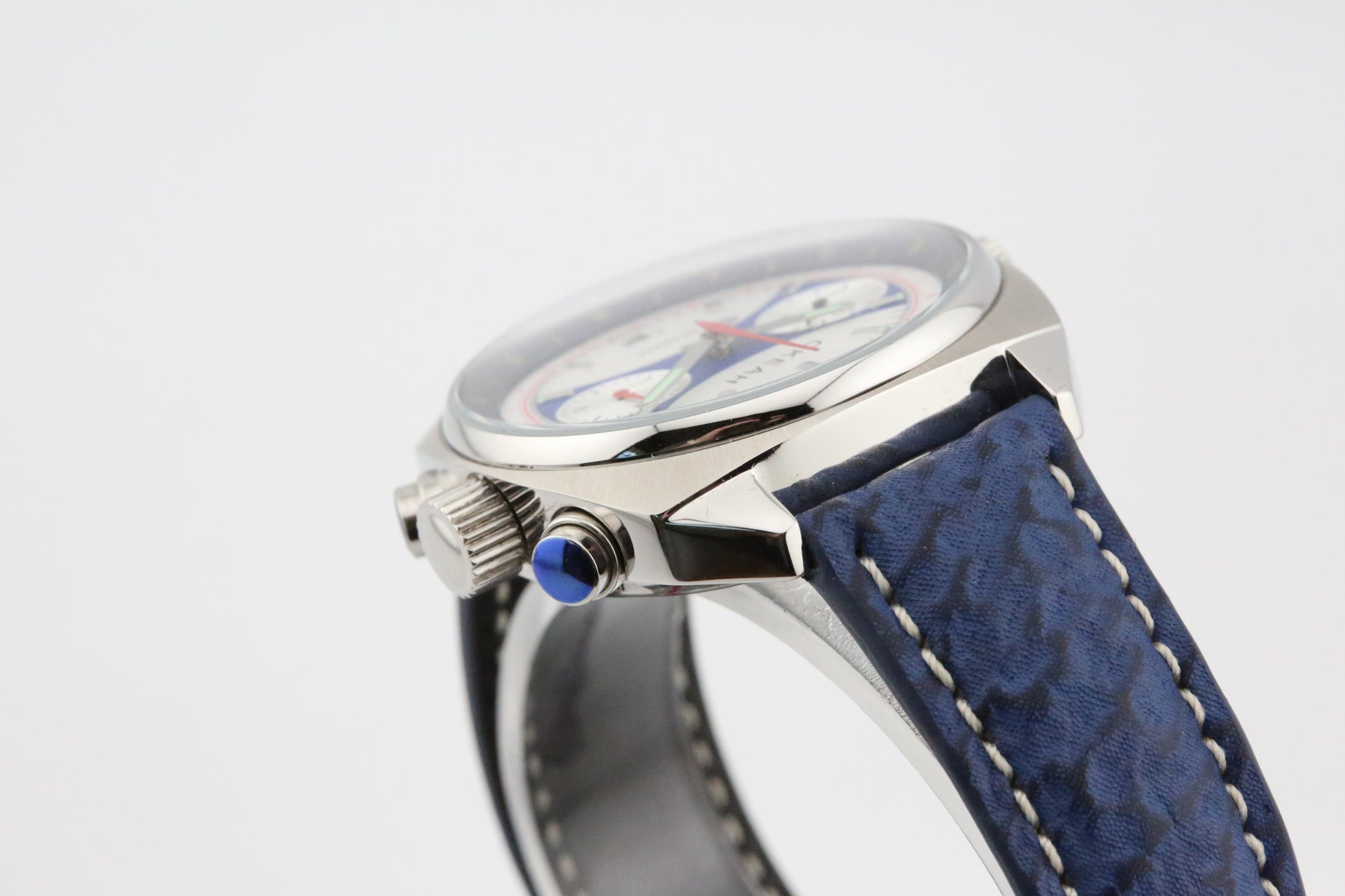 Design: Matte blue dial with contrasting white and red subdials for enhanced readability