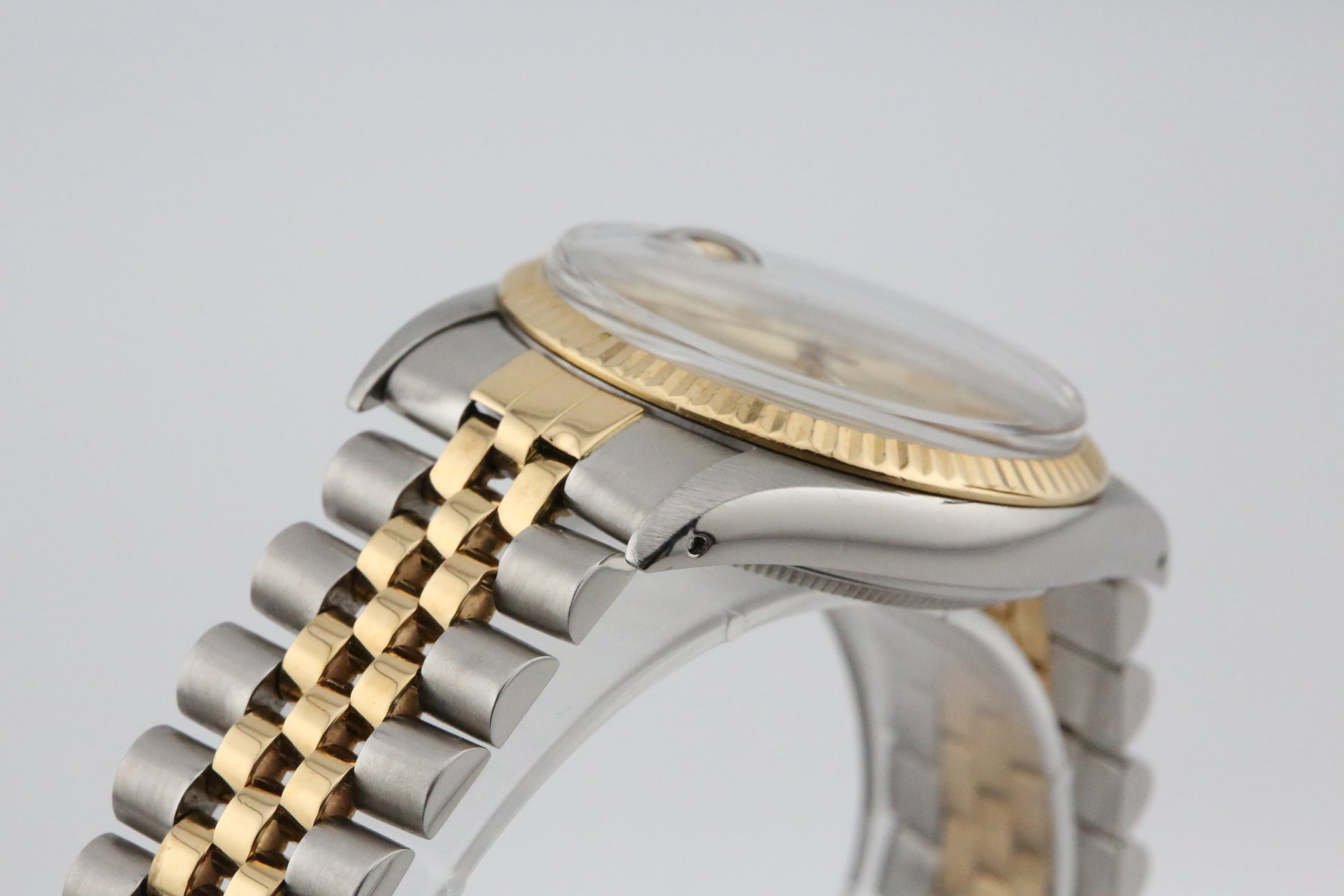 The Rolex Datejust 16013 Two-Tone is a timeless piece that exemplifies Rolex's dedication to quality and style. Its combination of stainless steel and 18K yellow gold, coupled with the reliable Caliber 3035 movement, makes it both a functional and luxurious choice. The champagne dial and Jubilee bracelet add to its elegance, making it suitable for both formal and casual occasions. This watch is a true icon of horology, cherished for its versatility, precision, and enduring appeal.