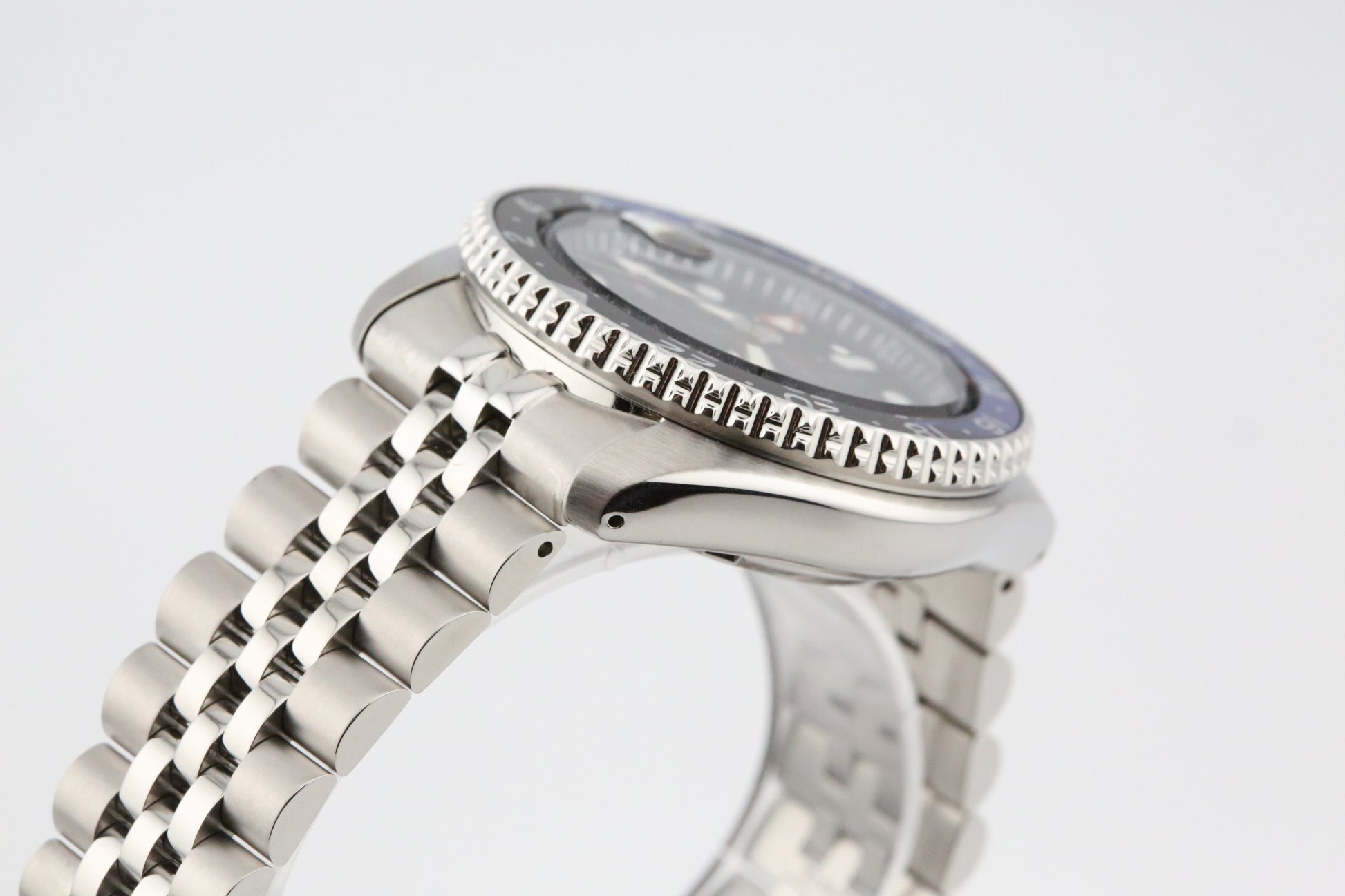 Features: Date window at the 3 o'clock position, GMT hand with a red tip for easy tracking of a second time zone