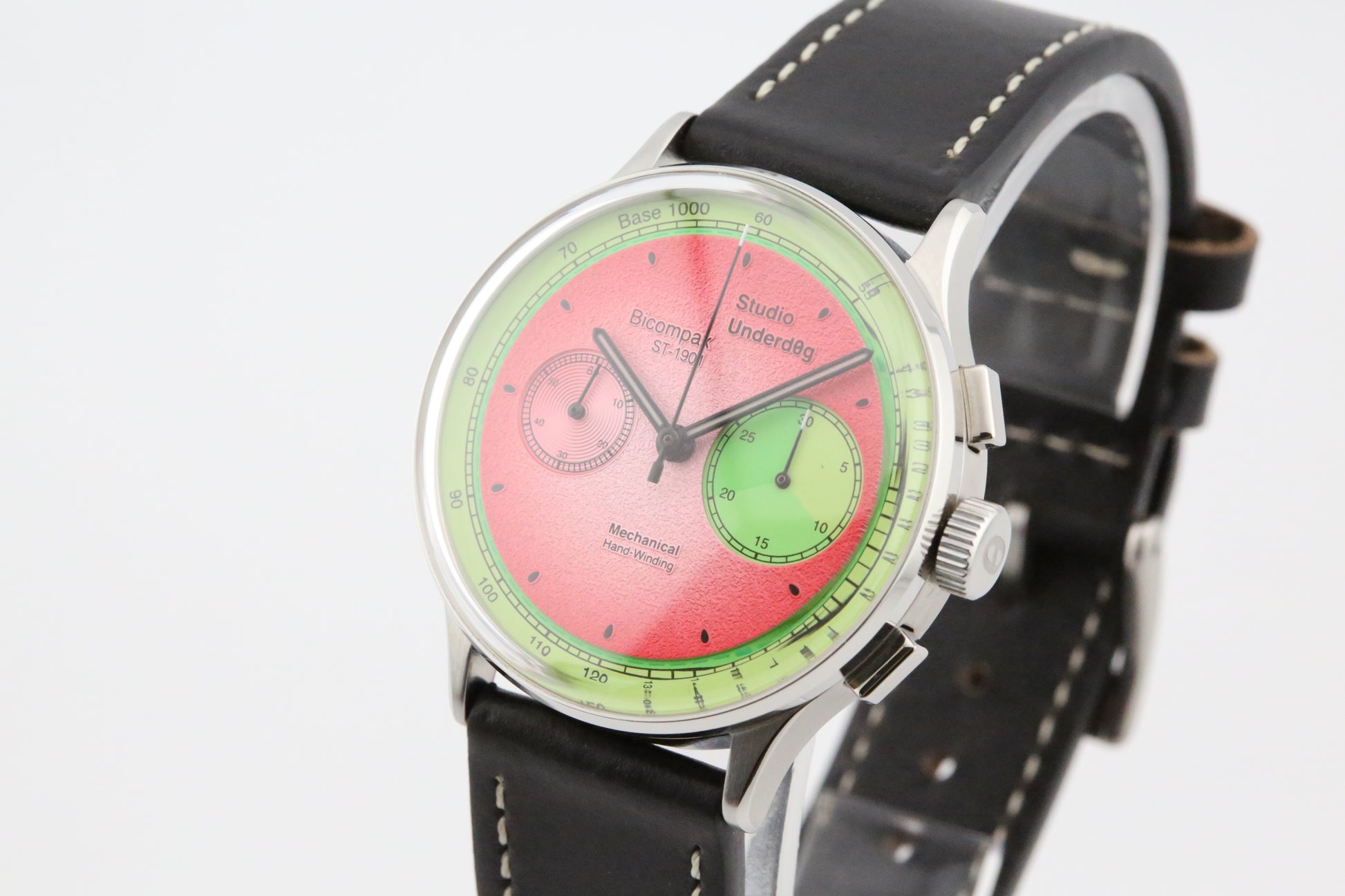 The Studio Underdog Watermelon watch is more than just a timekeeping device—it's a conversation starter. Its playful and colorful design, coupled with a reliable manual winding chronograph movement, makes it a delightful addition to any watch collection. Perfect for those who want to express their individuality and enjoy a touch of whimsy in their everyday accessories.