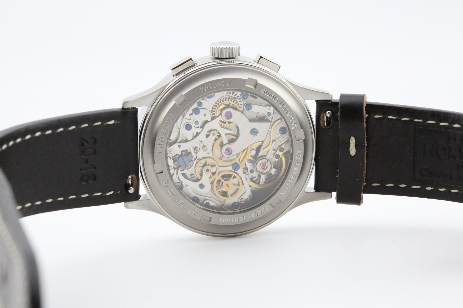 Exhibition Case Back: Showcases the intricate manual winding chronograph movement
