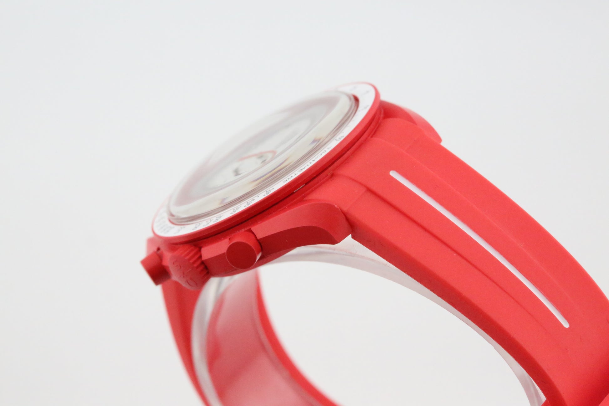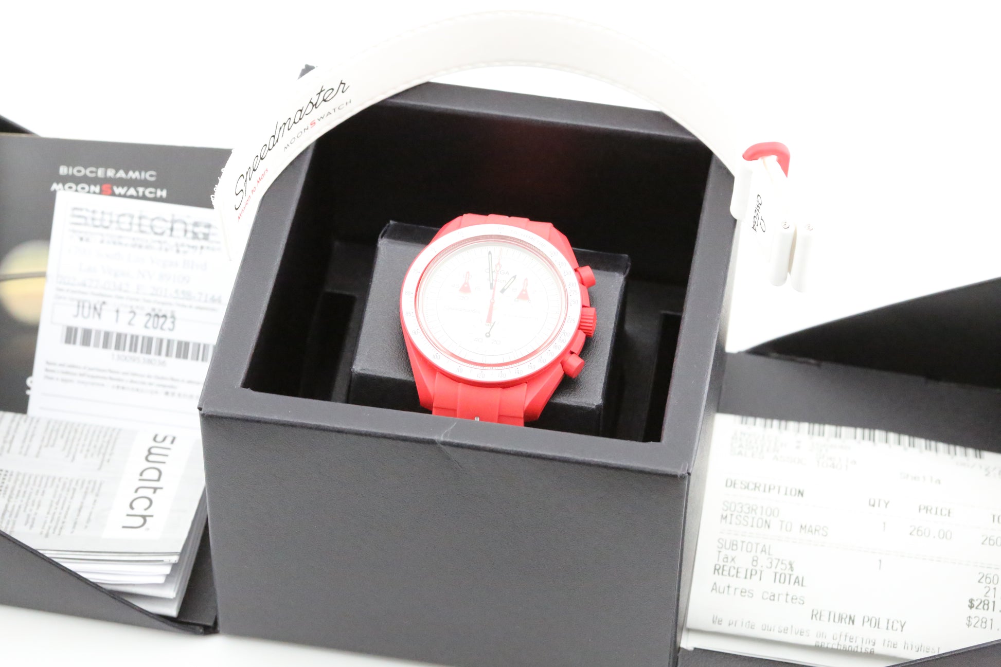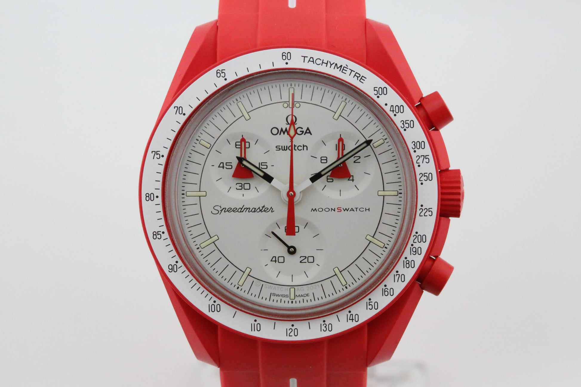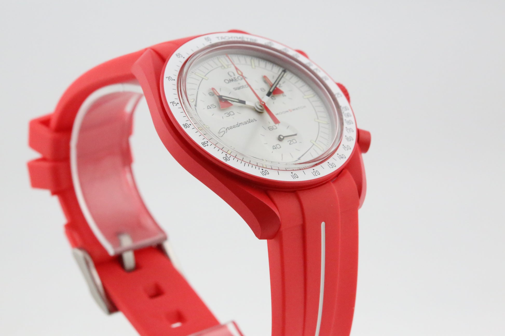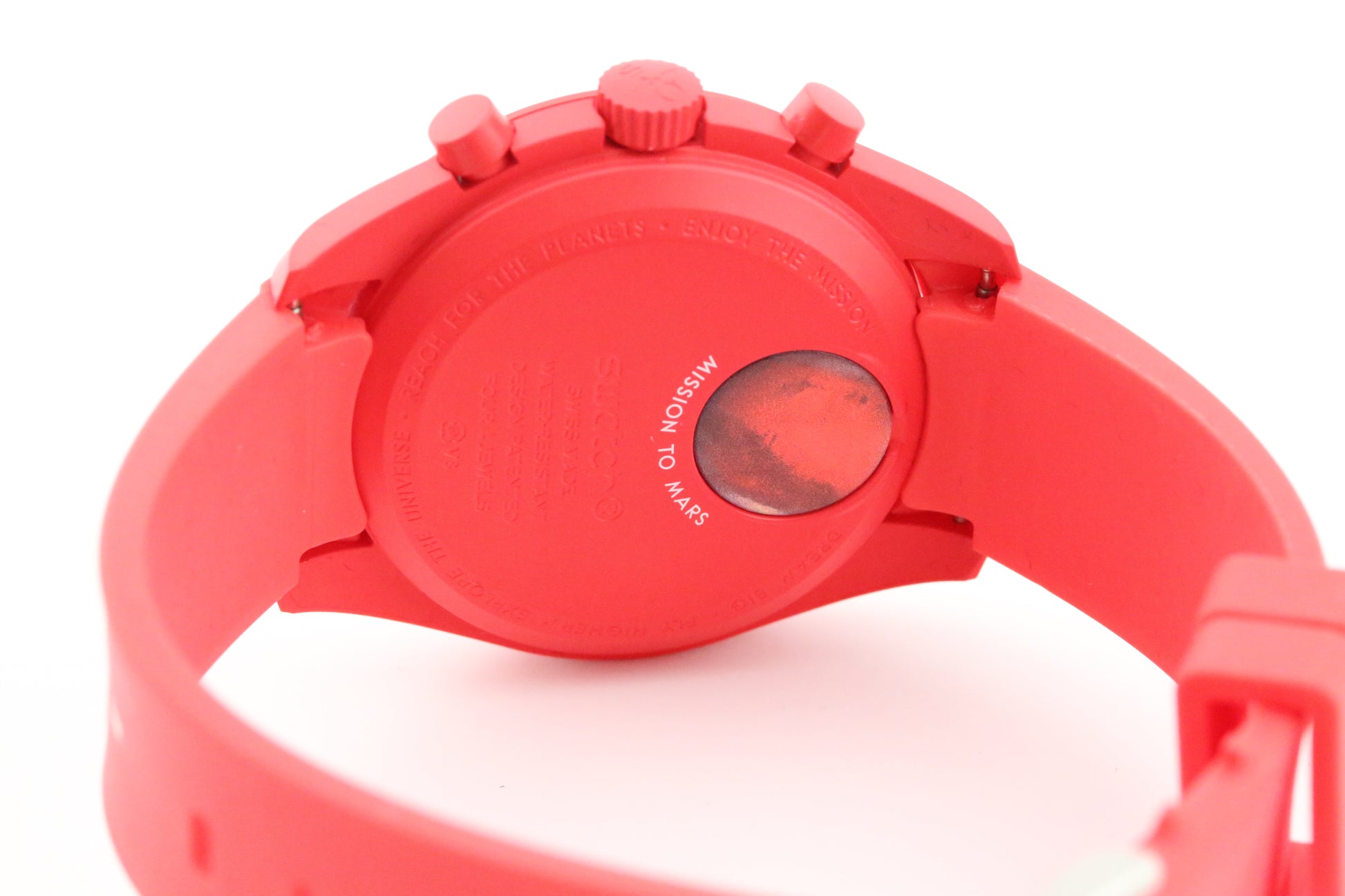 The Omega x Swatch Moonswatch Mission to Mars is an imaginative and accessible homage to the spirit of Martian exploration. By combining Swatch's innovative Bioceramic material with Omega’s legendary Speedmaster design, this watch offers both style and functionality. Its striking red and white color scheme, precise quartz movement, and iconic design elements make it a standout piece in any collection. Perfect for space enthusiasts and those who appreciate unique, high-quality timepieces.