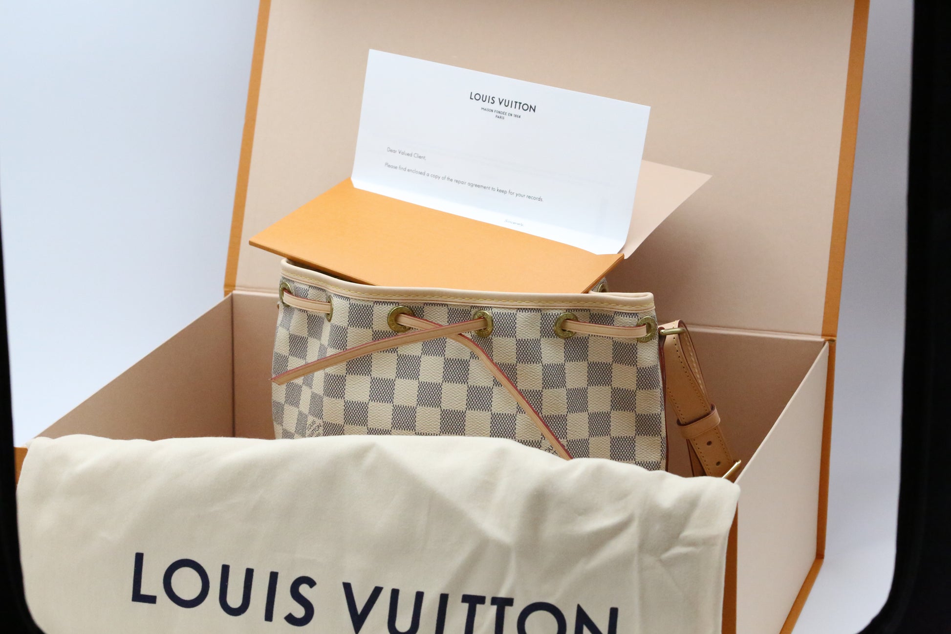 This item has been completely overhauled and refurbished by Louis Vuitton. Refurbishment paperwork included as well as eBay Authenticity Guarantee paperwork. However, the original canvas is slightly yellowed compared to a brand new bag from LV.