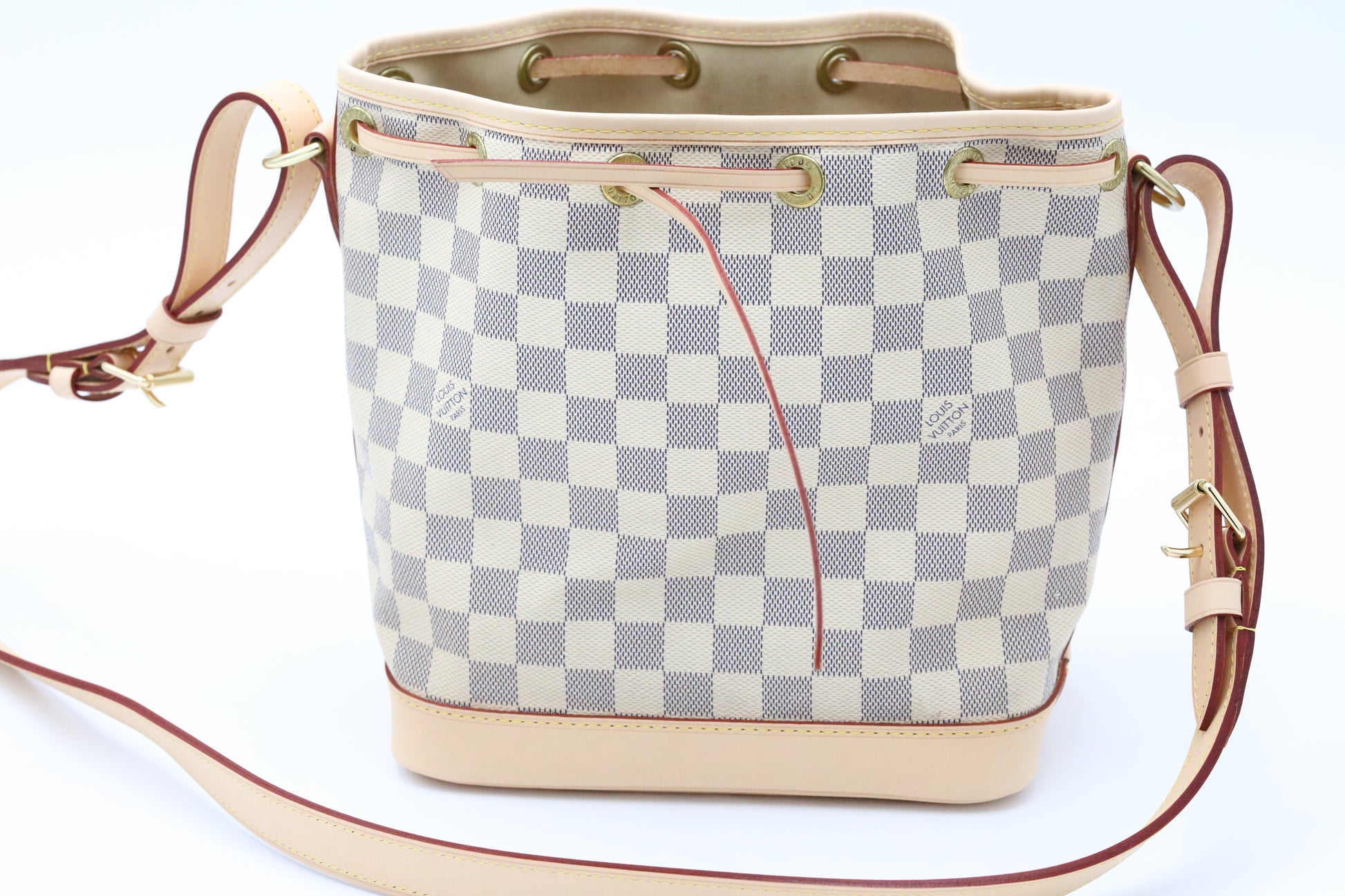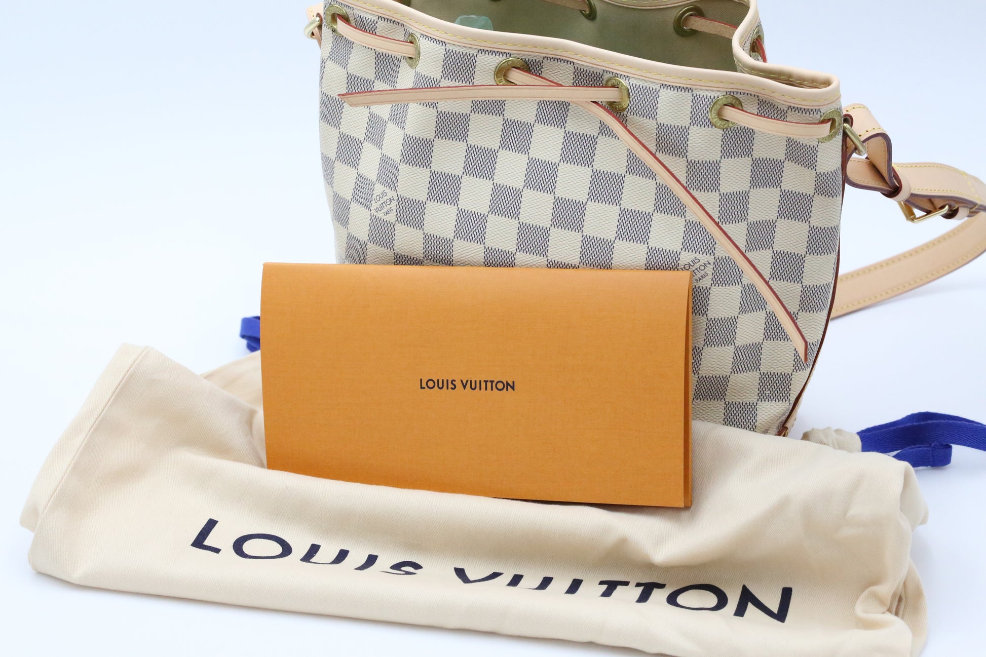 The Louis Vuitton Noé BB Bag in Damier Azur Canvas is a chic and compact reinterpretation of the iconic Noé silhouette. Originally designed in 1932 to transport champagne bottles, the Noé bag has evolved into a timeless symbol of Louis Vuitton's craftsmanship. This BB-sized version, crafted in the signature Damier Azur canvas, exudes a casual elegance, perfect for both day and evening wear.