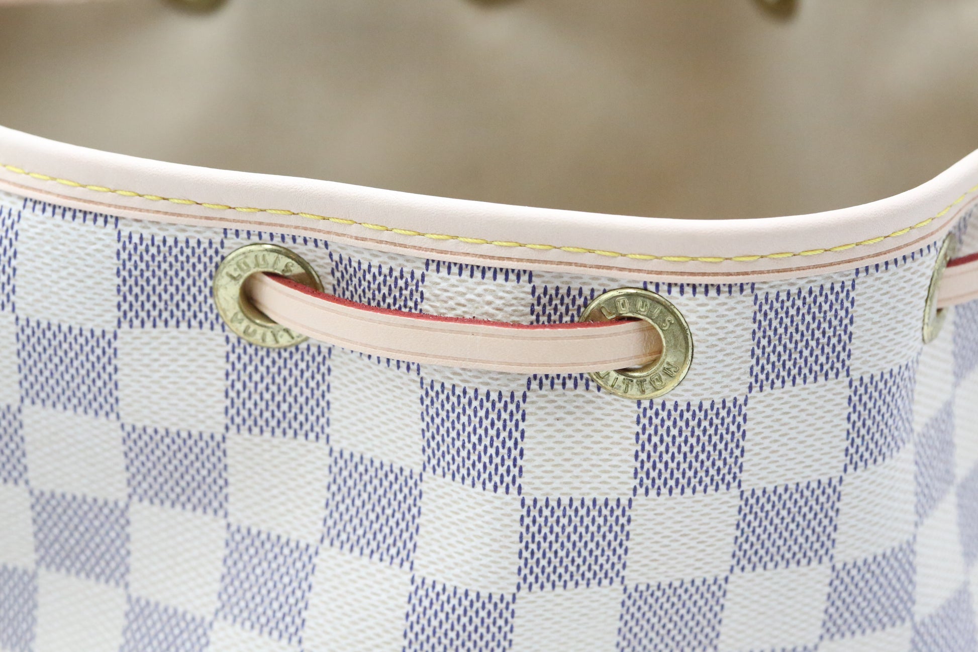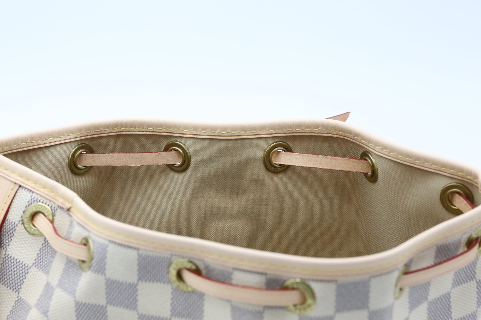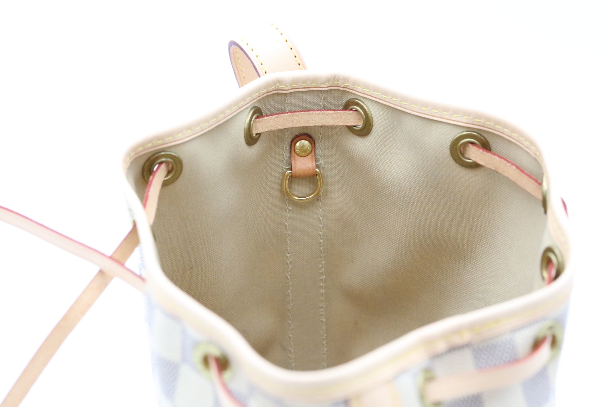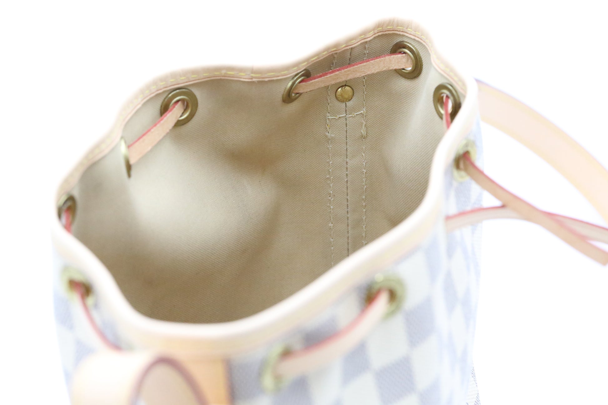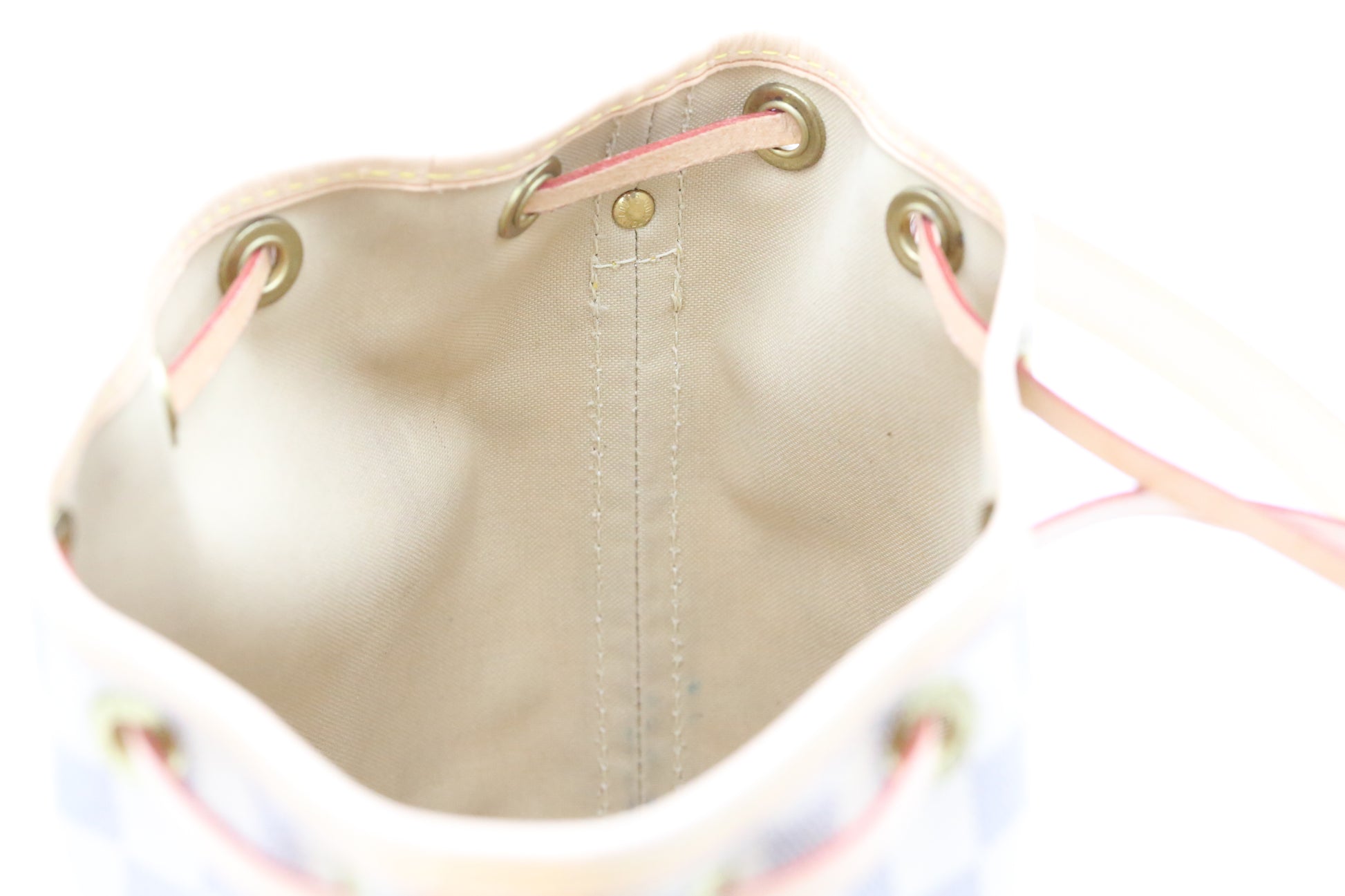 The Damier Azur canvas is lightweight yet durable, providing a stylish and sturdy exterior. Accented with natural cowhide leather trim, the bag features gold-tone hardware for a luxurious finish. The leather drawstring closure allows easy access to the spacious interior, which is lined with soft textile fabric, providing ample room for everyday essentials despite its compact size.