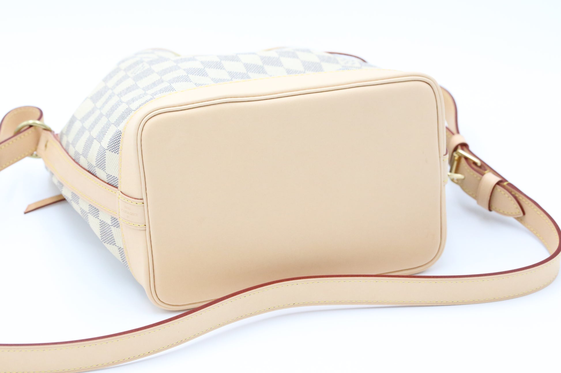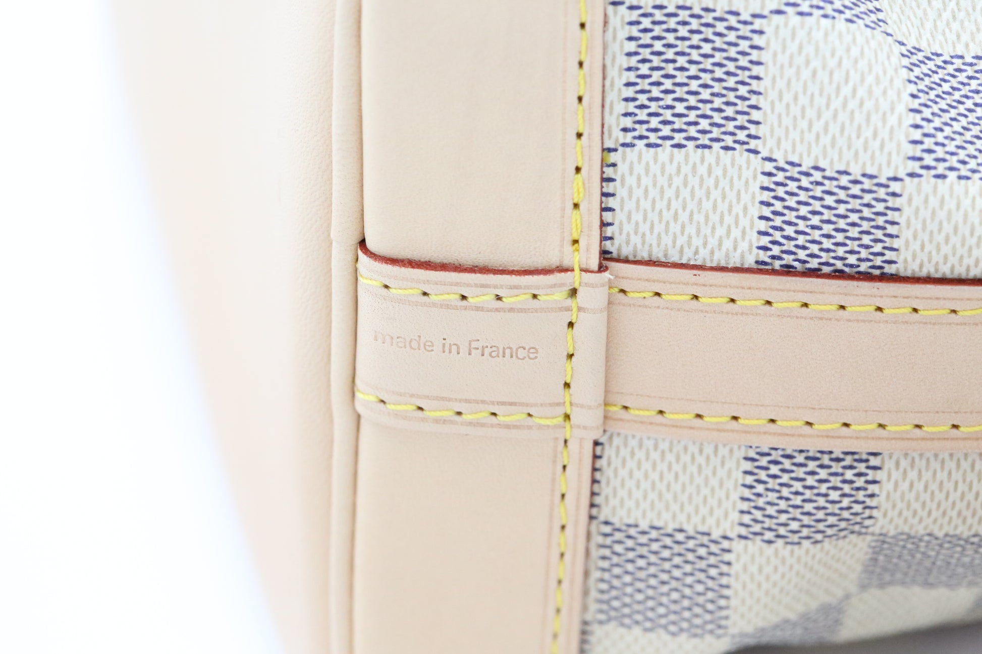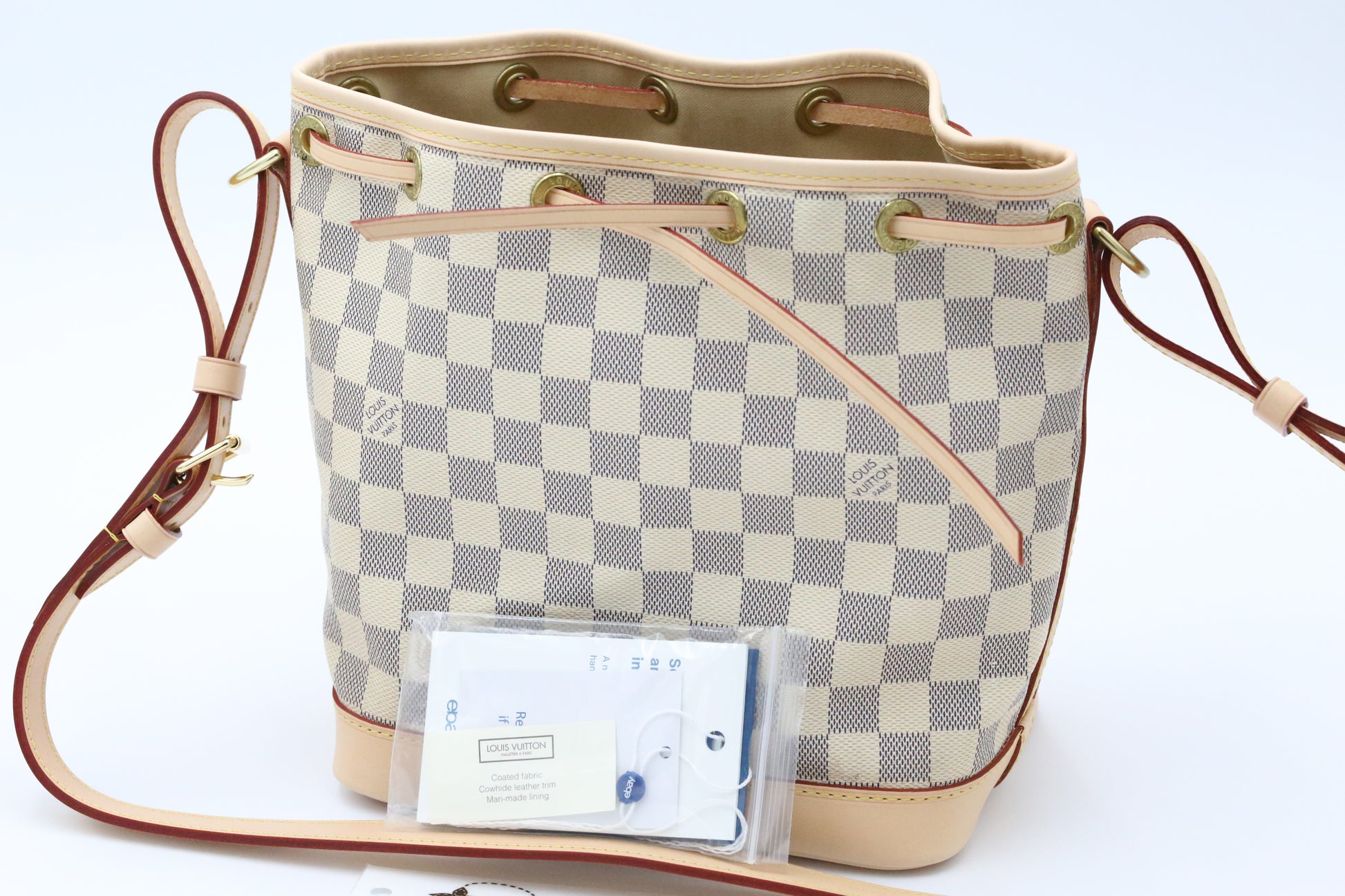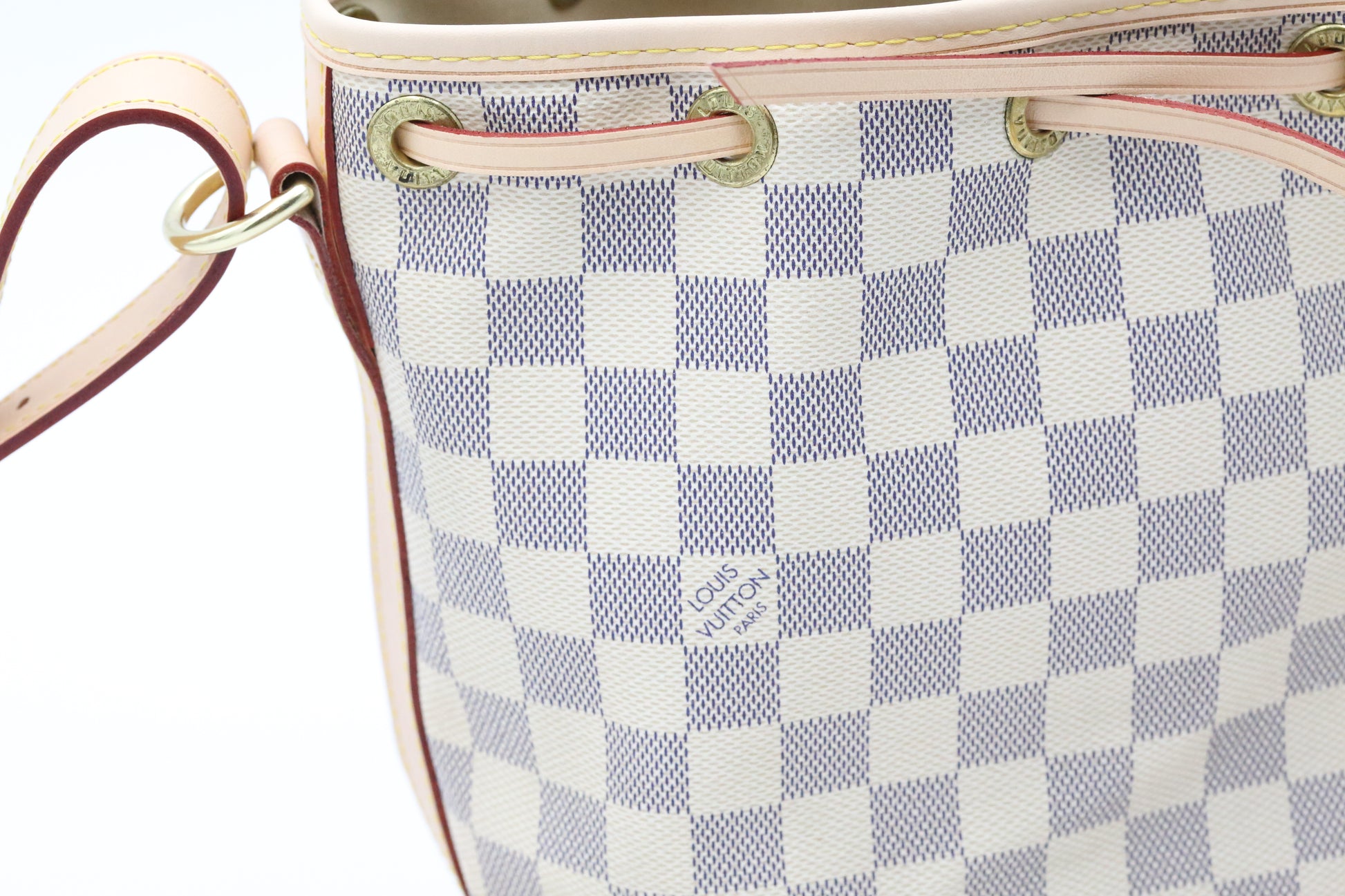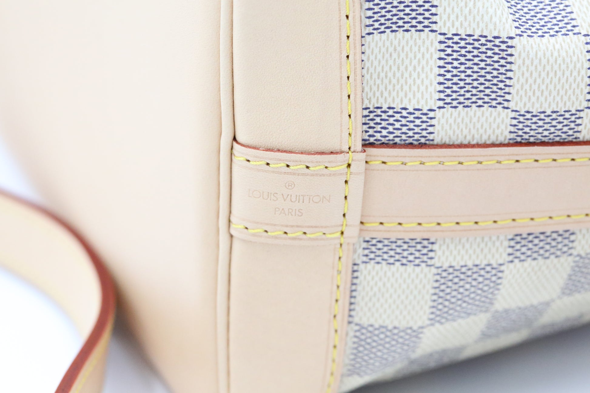 The Damier Azur canvas is lightweight yet durable, providing a stylish and sturdy exterior. Accented with natural cowhide leather trim, the bag features gold-tone hardware for a luxurious finish. The leather drawstring closure allows easy access to the spacious interior, which is lined with soft textile fabric, providing ample room for everyday essentials despite its compact size.