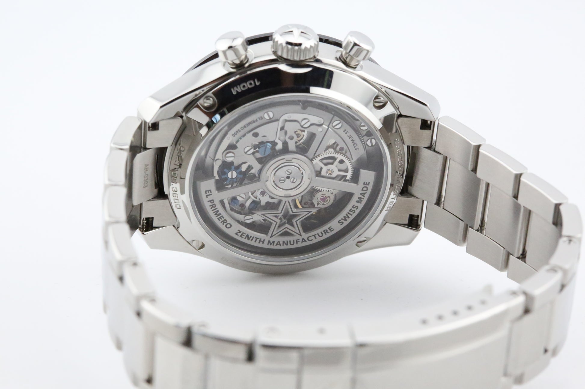 Movement: El Primero 3600 automatic chronograph movement. This legendary movement is known for its incredible precision, beating at 5Hz and offering 1/10th of a second chronograph functionality. It has a 60-hour power reserve, so you can take it off for a weekend and it will still be running when you put it back on.